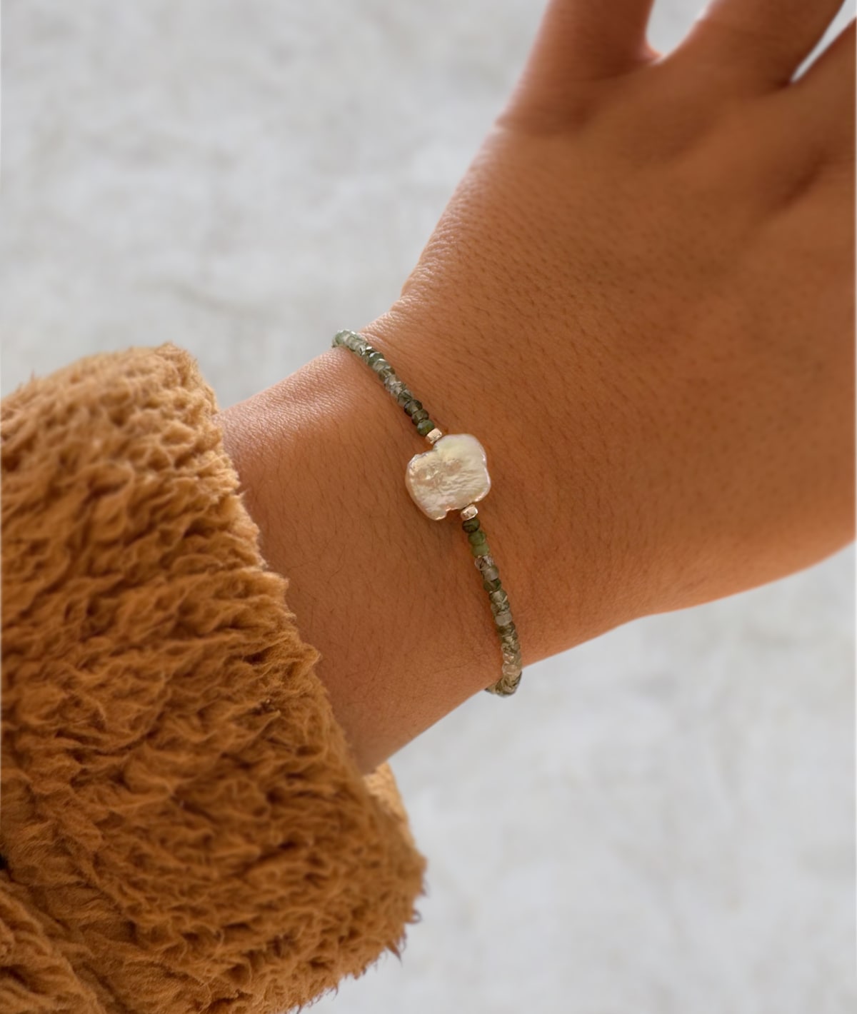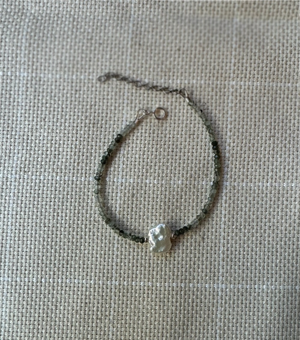 Green rutilated quartz is said to have soothing qualities. These beads were hand strung, along with a baroque pearl and sterling silver accents to form this bespoke bracelet! Wear it on its own for an elegant look, or add it to your bracelet stack.