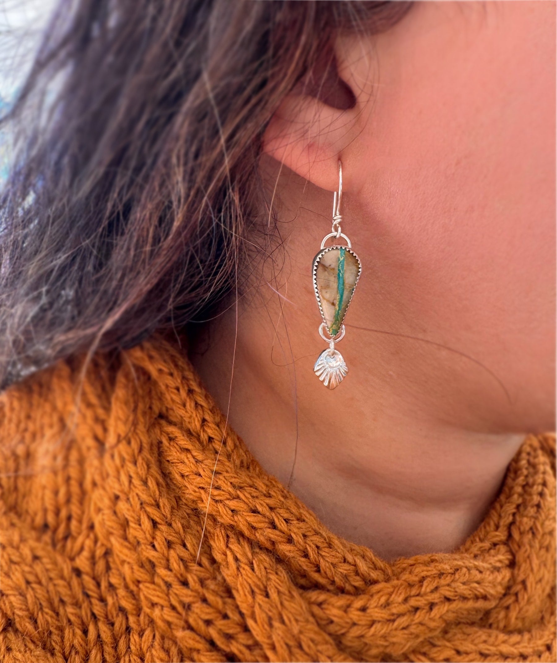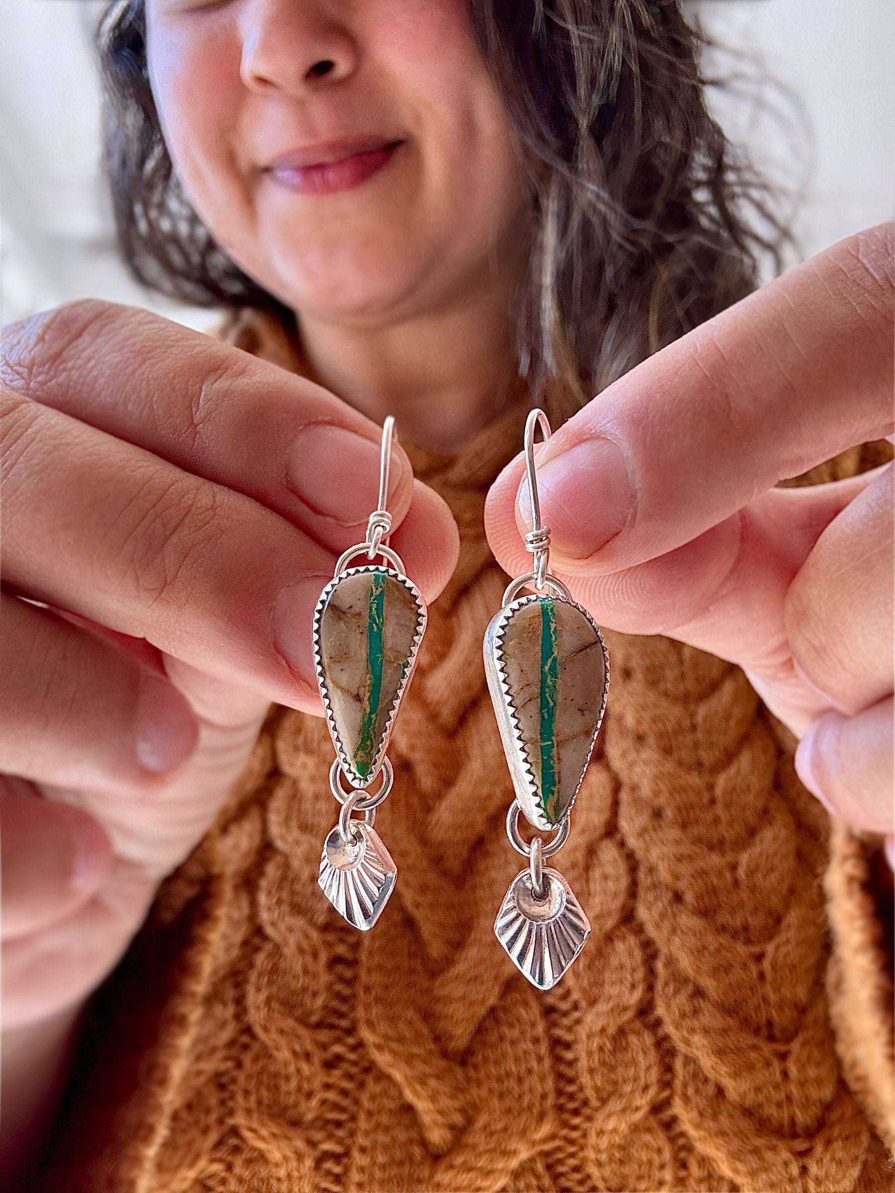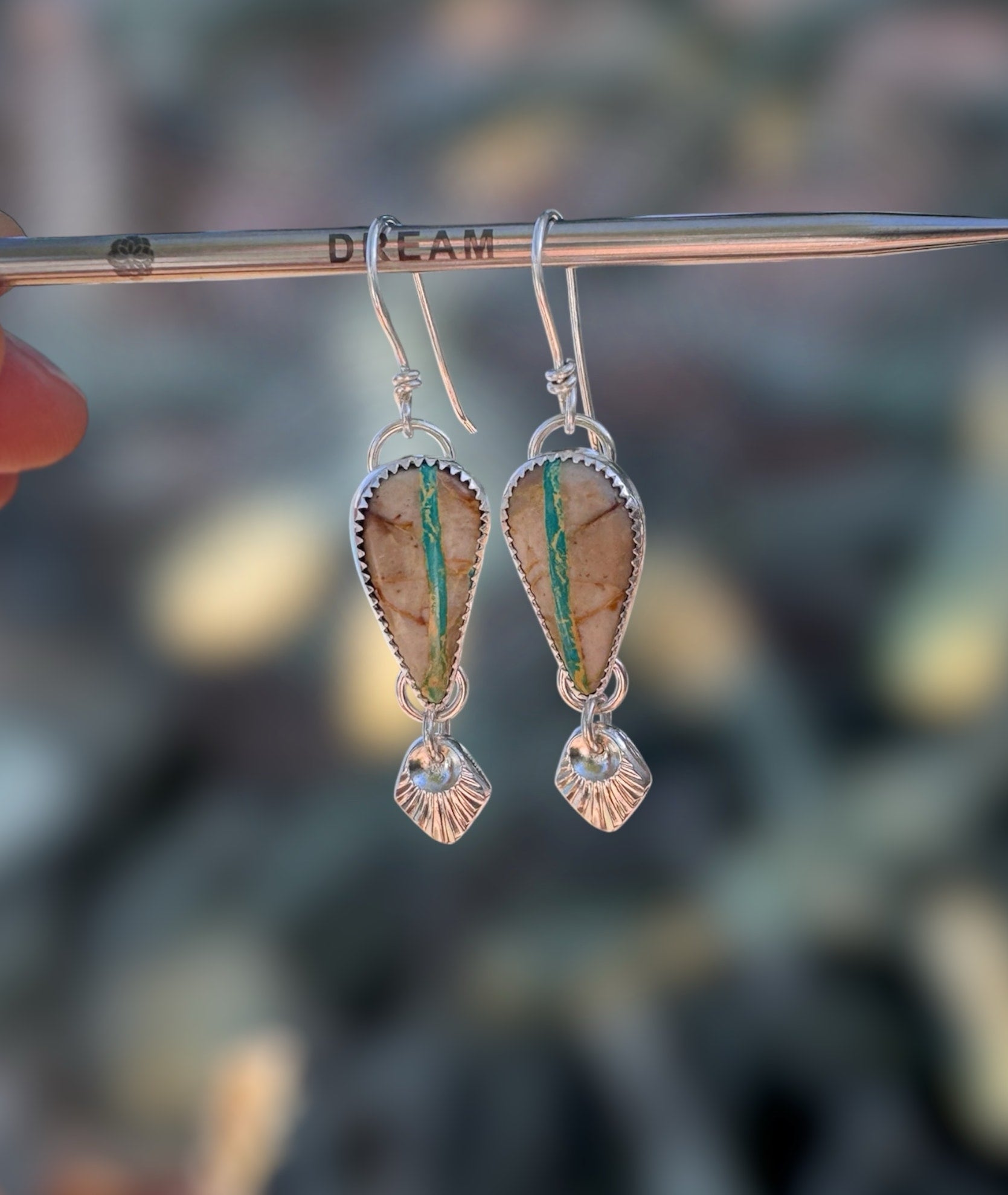There is nothing like the river of blue-green that runs through this Royston ribbon turquoise pair!  The handmade dangling parts are solid sterling silver and polished to a mirror shine, perfectly accenting these stones.