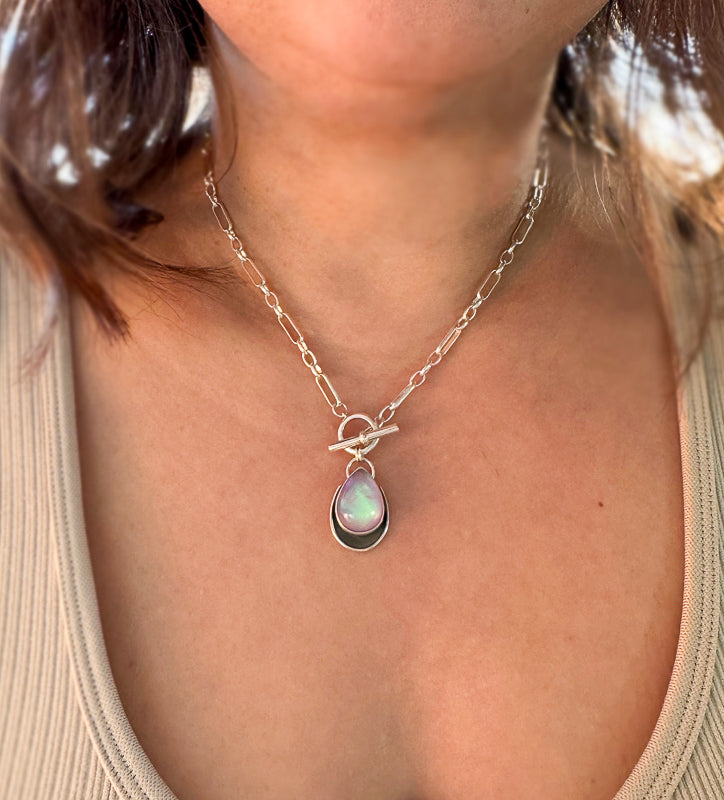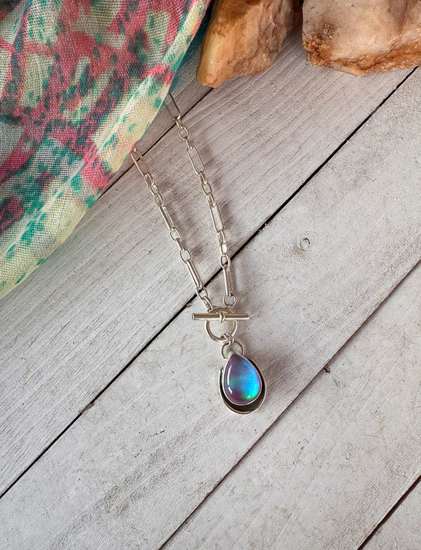 This necklace features a stunning teardrop aurora opal that radiates with captivating iridescence. The opal’s shifting colors in the light make it a truly mesmerizing piece. Set in sterling silver and finished with a sleek toggle clasp, this necklace is both elegant and effortlessly stylish. A unique and eye-catching accessory!