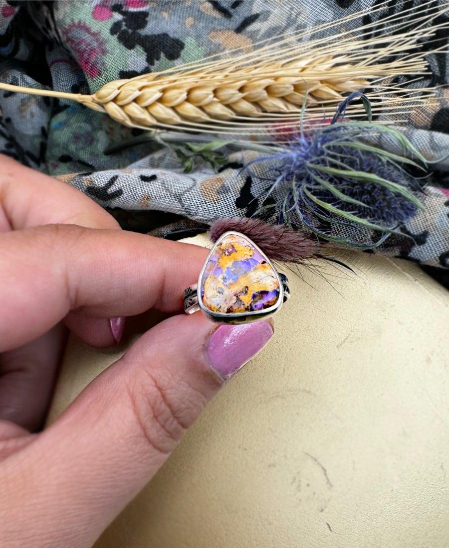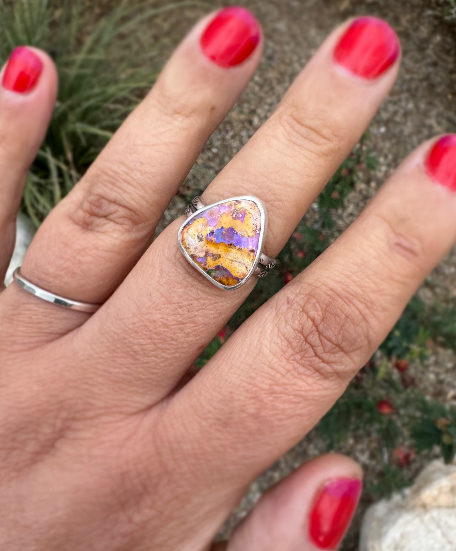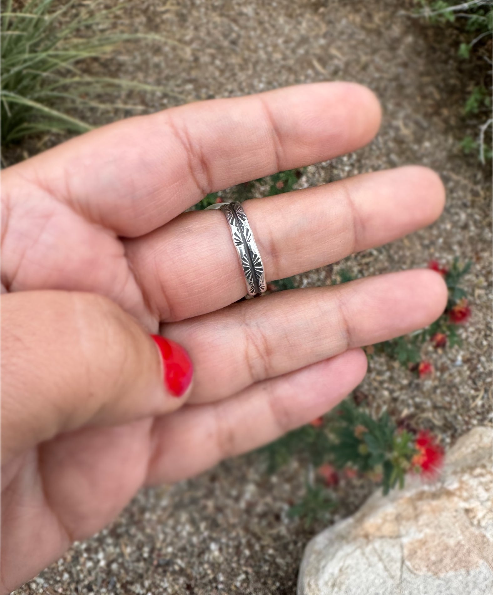 A gorgeous firey Cantera fire opal stone set in sterling silver. This is on a handstamped band and has a boho vibe. This stone gives off its iridescent color distinctive to the fire opal - it has a purple sparkle that is truly stunning!