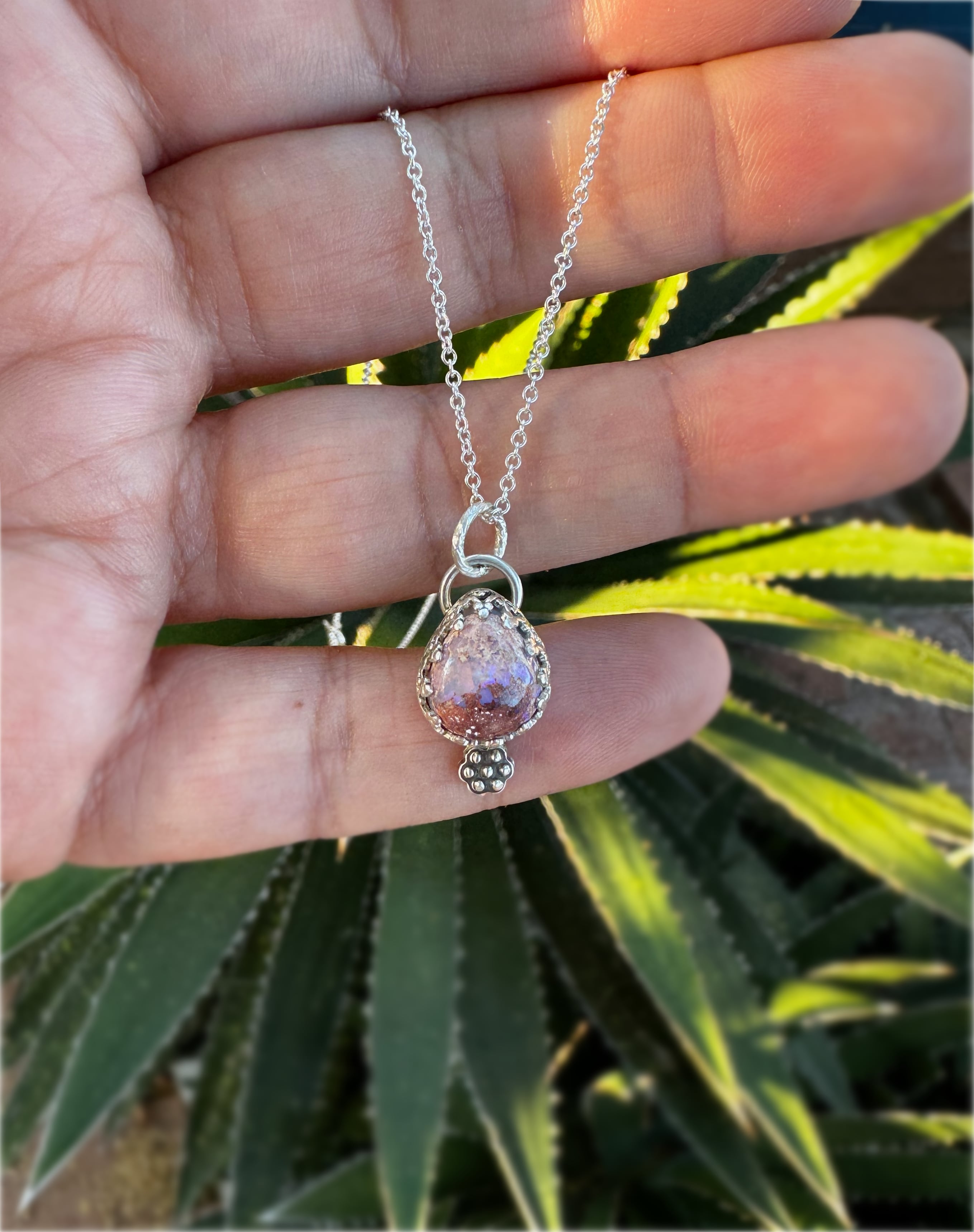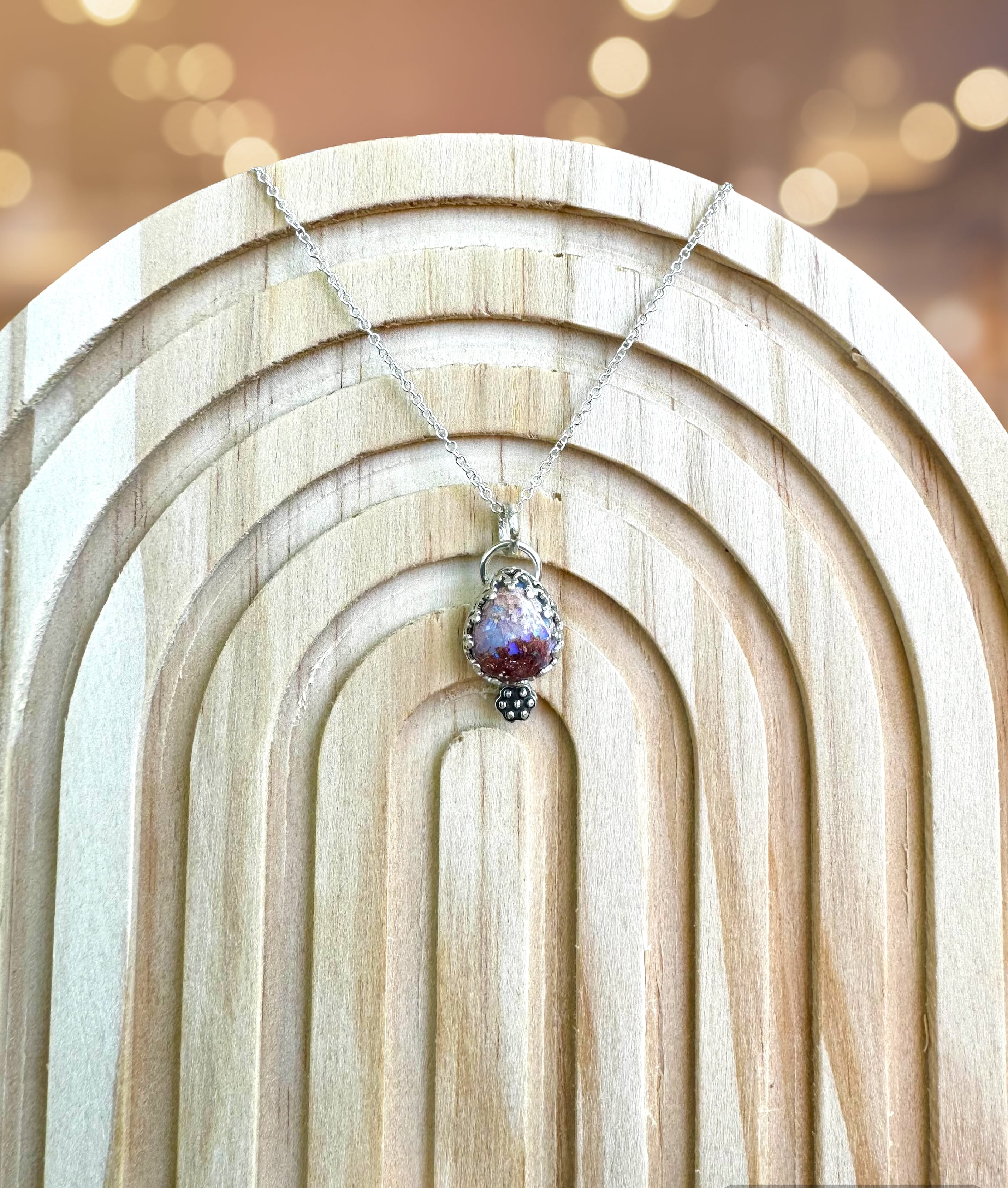 This pear shaped Mexican fire opal is set in sterling silver with hand forged details and a lightly hammered shimmery bail.  Has a beautiful opal flash that has hints of purple.  Comes on an 18 inch chain.