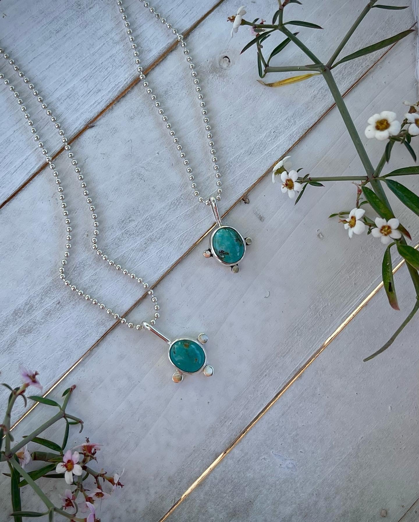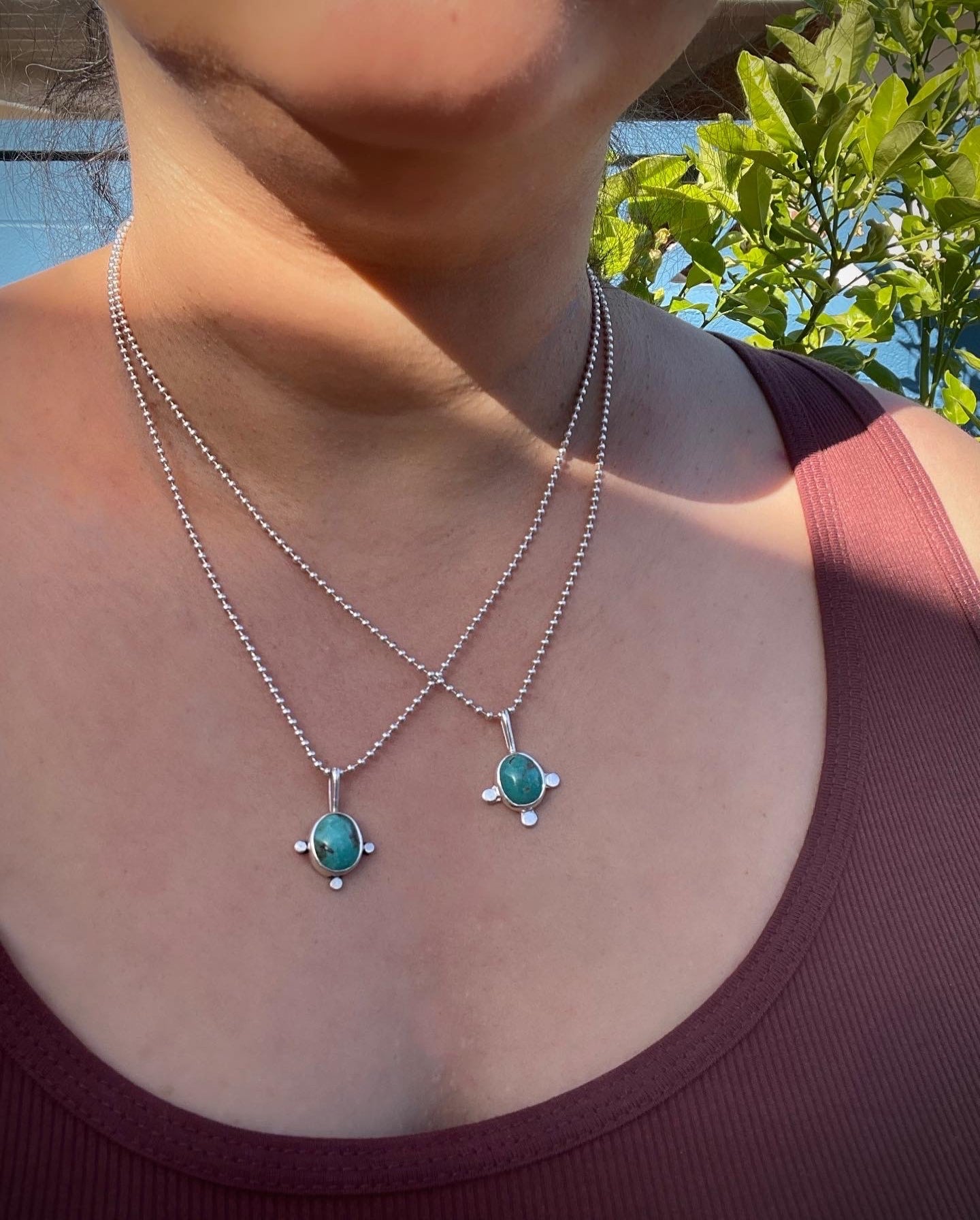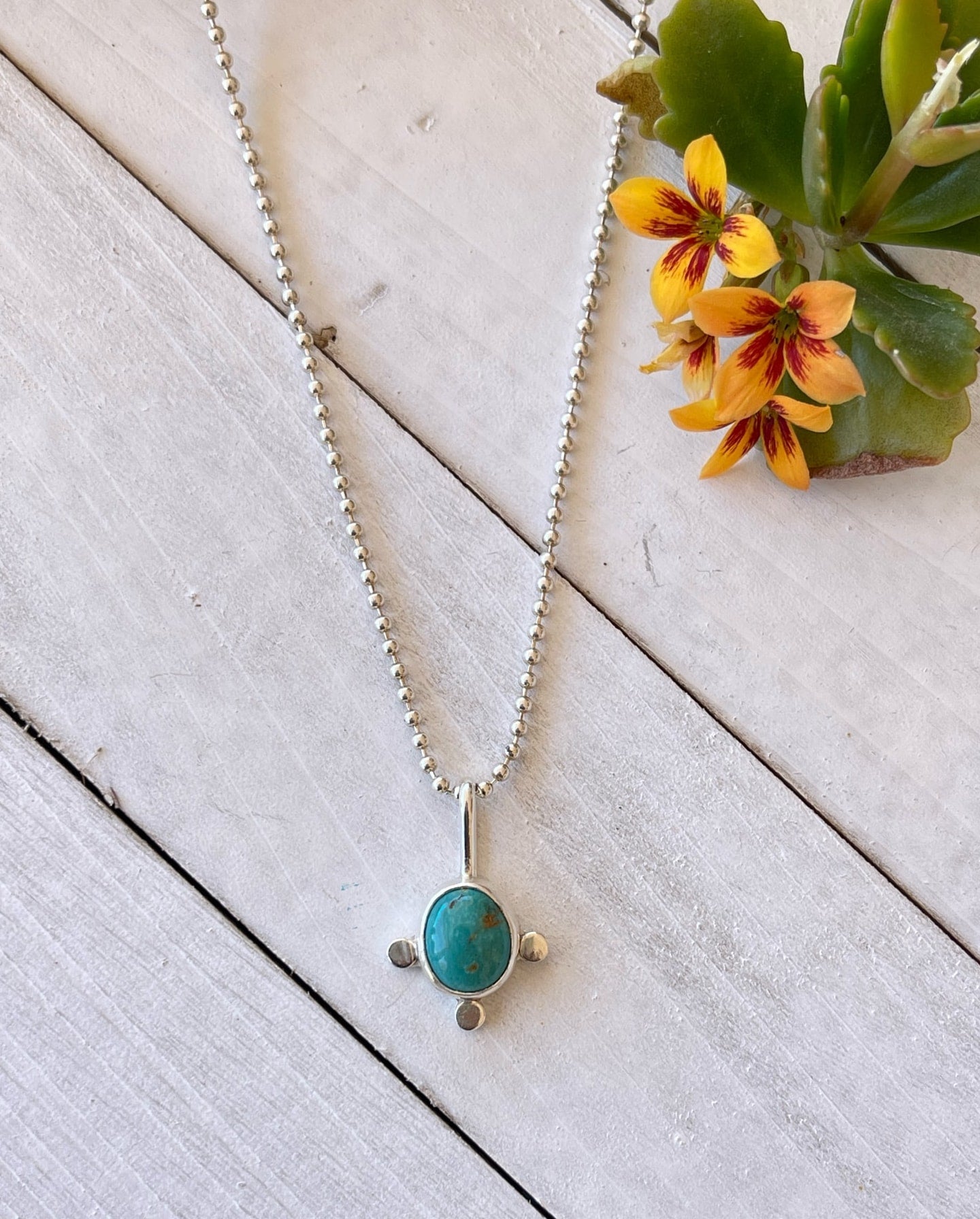This cute turquoise sterling silver pendant is perfect for layering with other necklaces. The oval shaped turquoise is adorned with three hand forged little circles around the bezel for an organic look. Comes on an 18 inch bead chain, with a 2 inch extender attached, so max worn length is 20 inches.