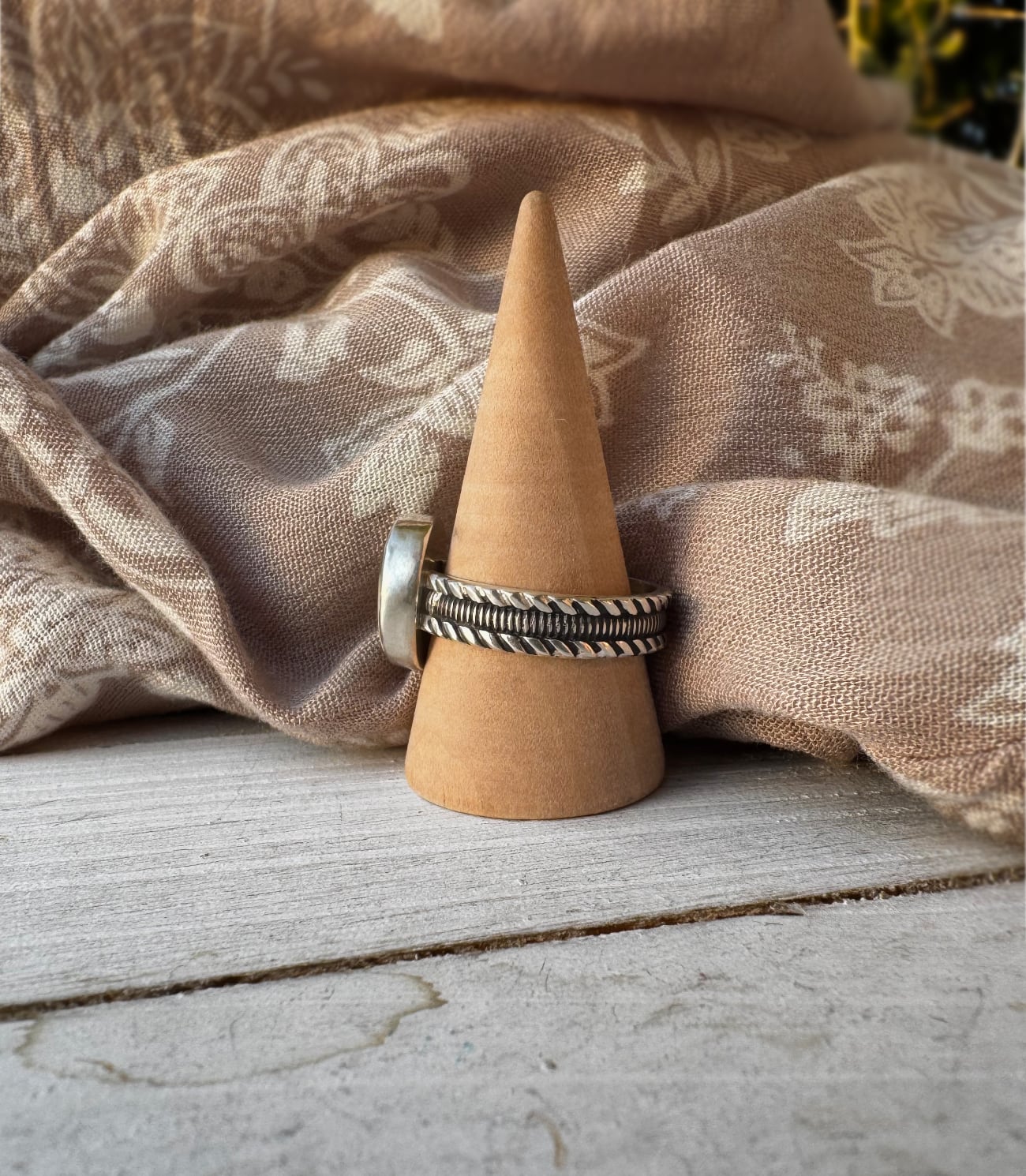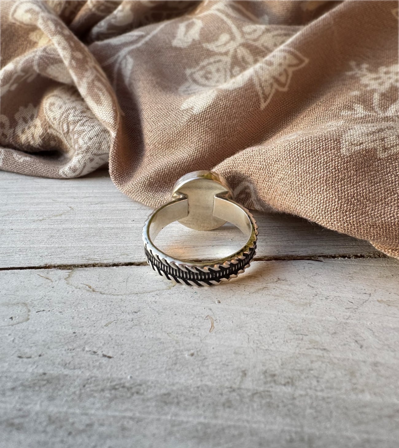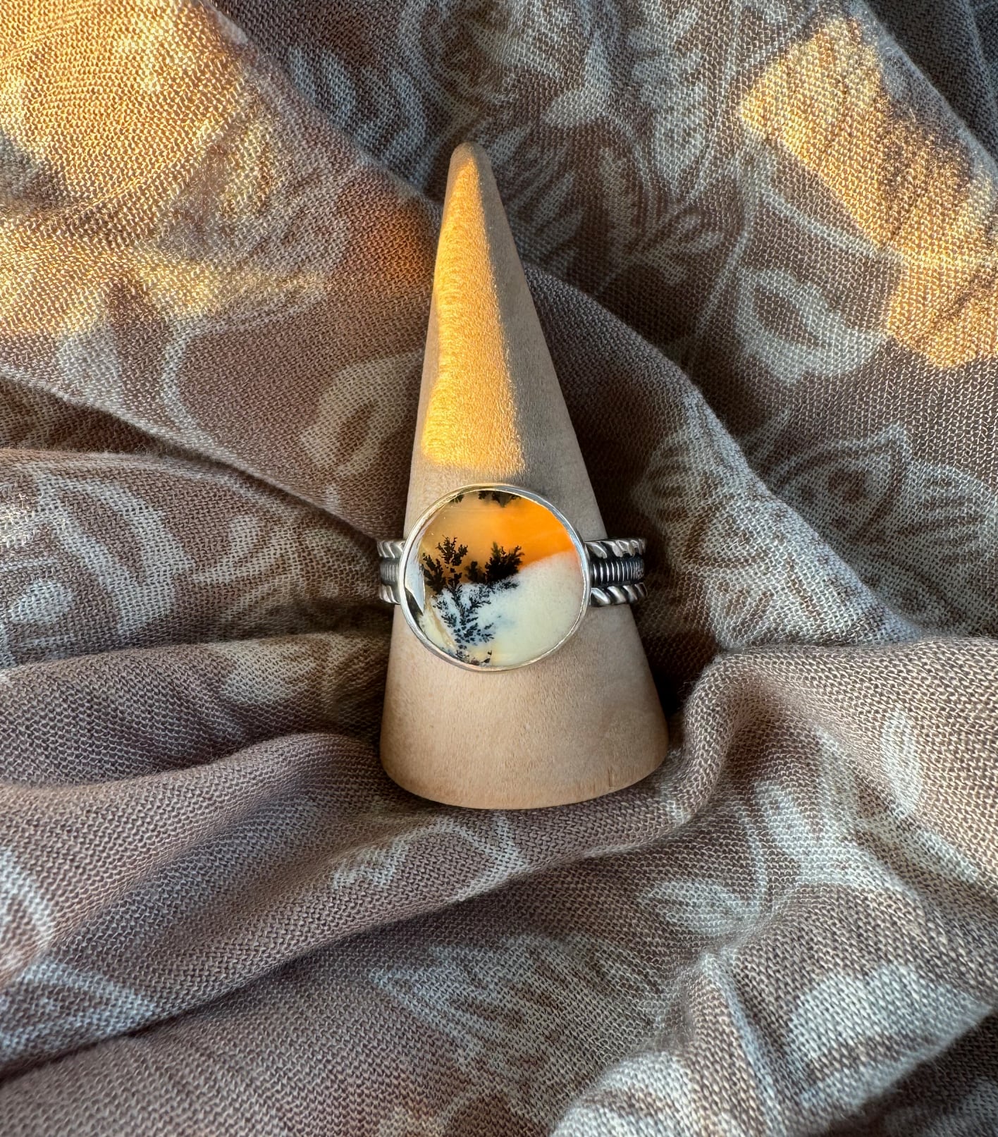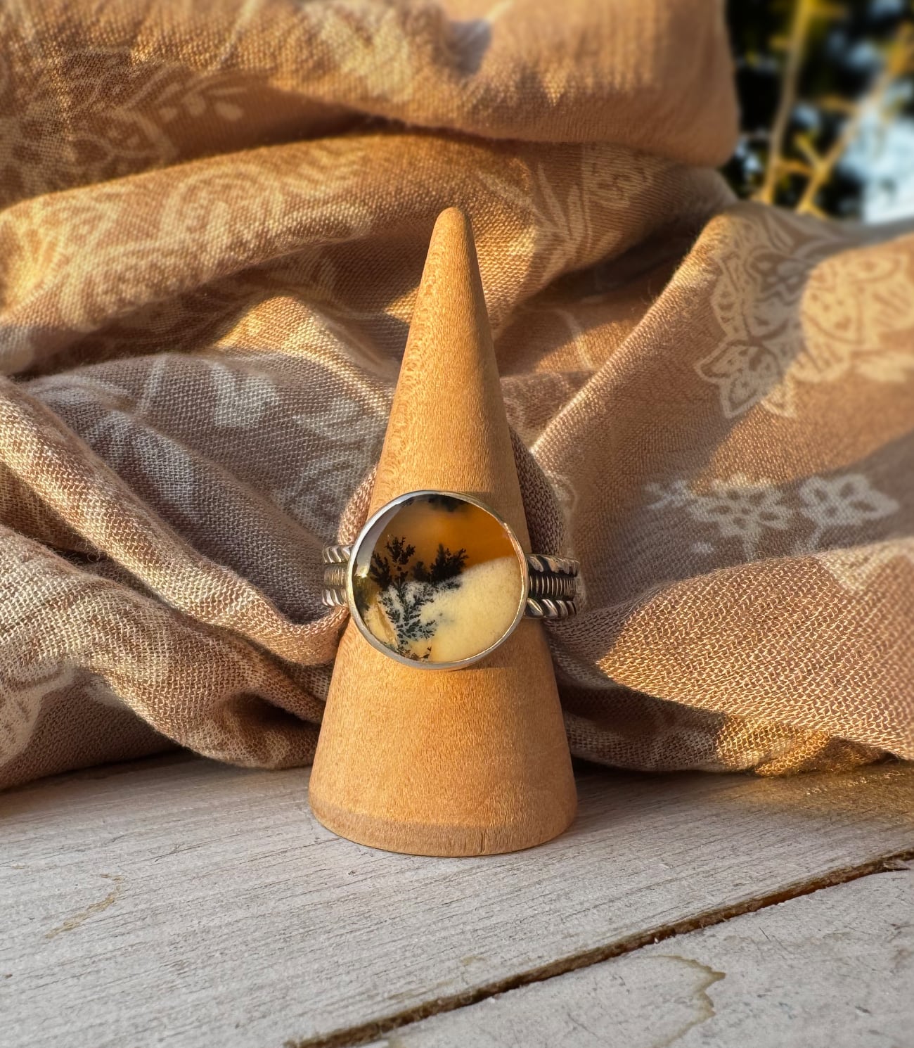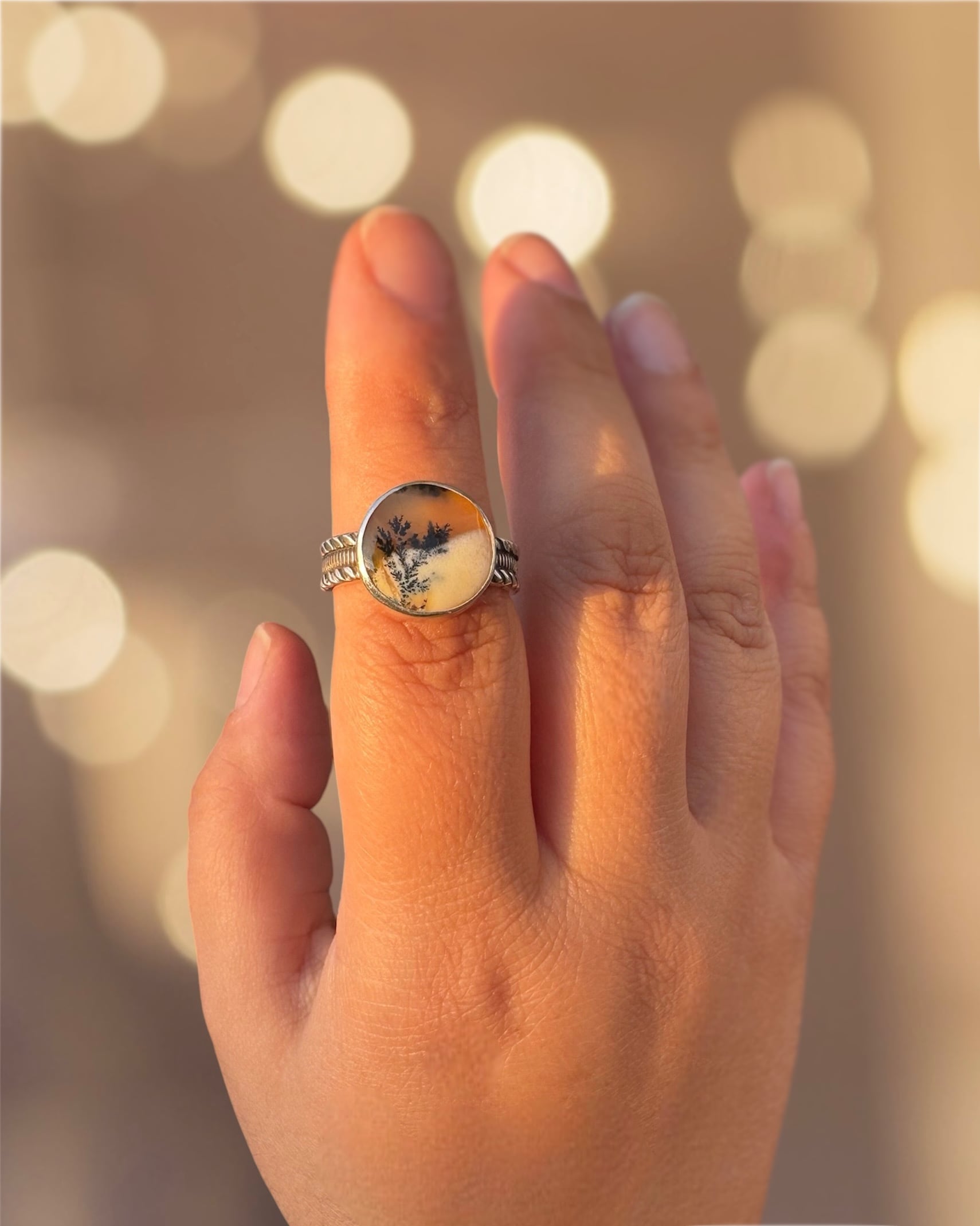 This dendritic agate stone's natural patterns resemble delicate tree-like formations, creating a miniature landscape on your finger! This is a one of a kind scenic gem, as this perfect stone was such a rare find. Elevate your ring game with this stunning ring, or gift it to someone special who loves handmade nature-inspired jewelry!