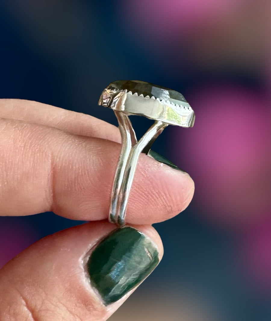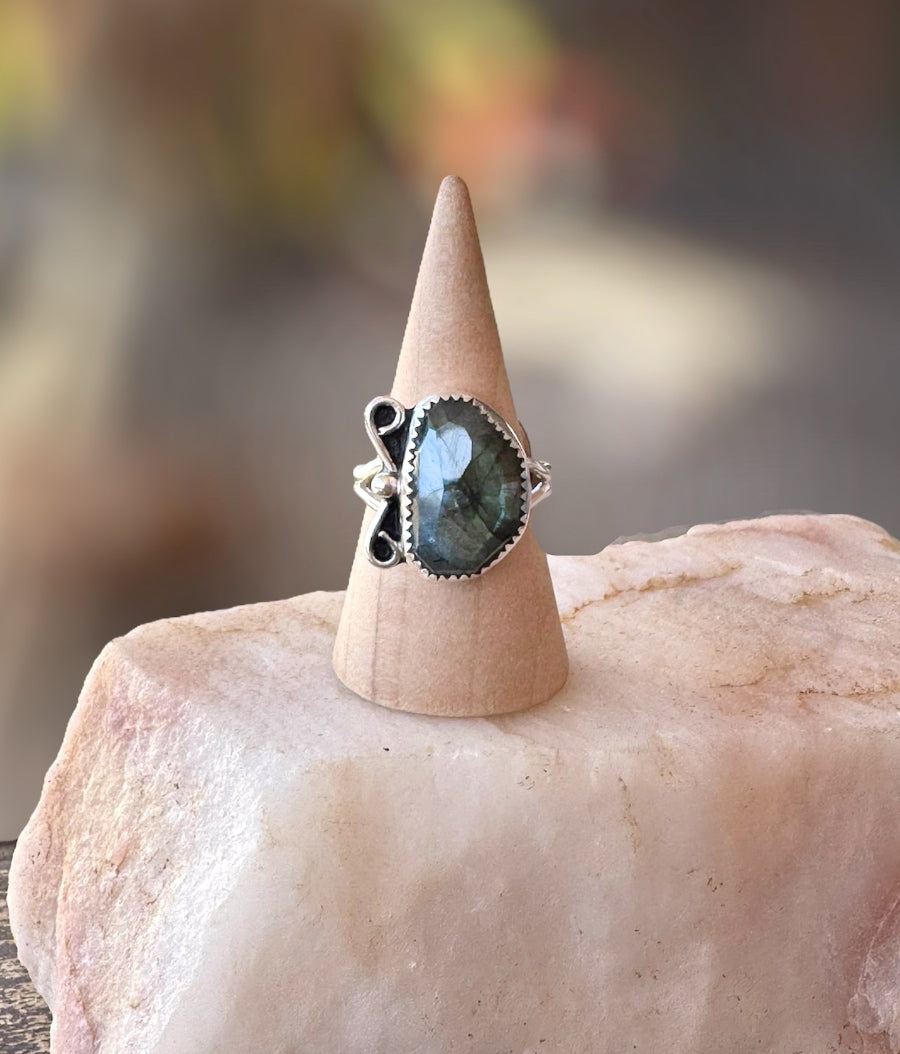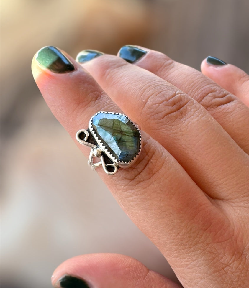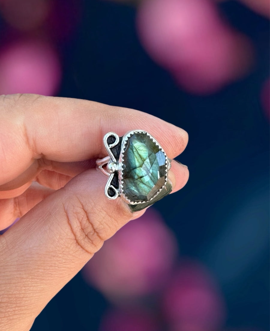 This ring features a mesmerizing faceted labradorite gemstone with an iridescent glow that shifts with the light. Set in a detailed bezel with delicate silverwork, this piece exudes a touch of whimsy and elegance. The flashes on this stone are just stunning! Perfect for anyone who loves unique, nature-inspired jewelry.