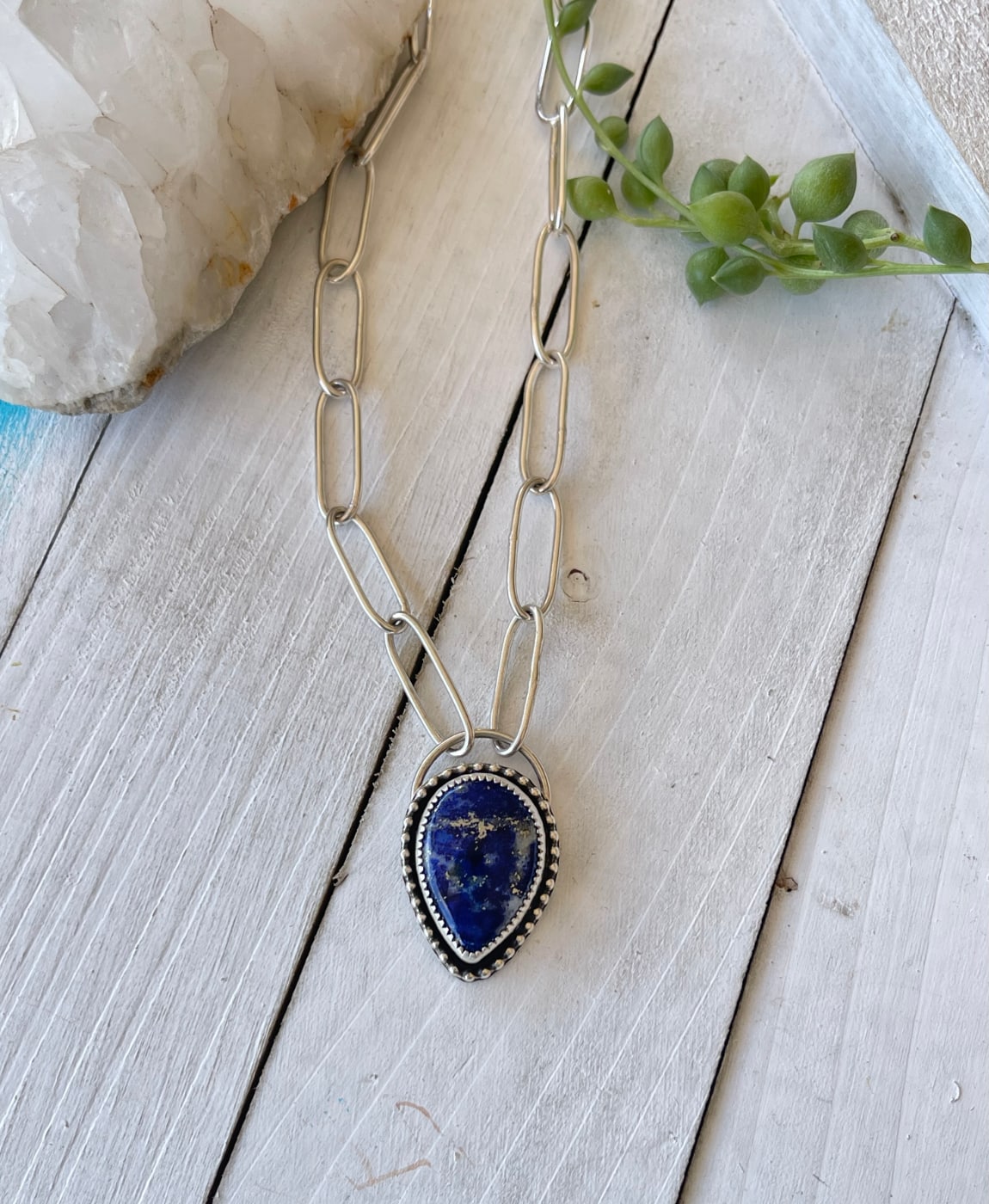 This is a stunning blue lapiz lazuli teardrop shaped stone set in sterling silver. The paperclip chain is entirely handmade from sterling silver wire. Easy S-hook closure.