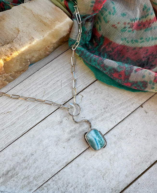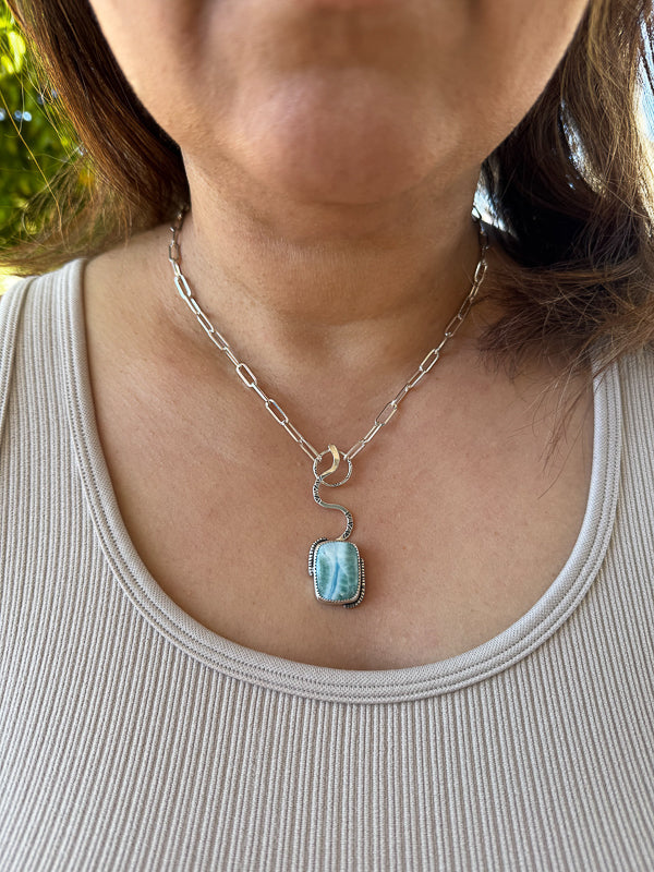 This necklace features a larimar stone, known for its calming blue hues. The stone has a unique hand stamped reveal border around the stone and is suspended on a handmade snake, with paperclip chain, creating a unique look.