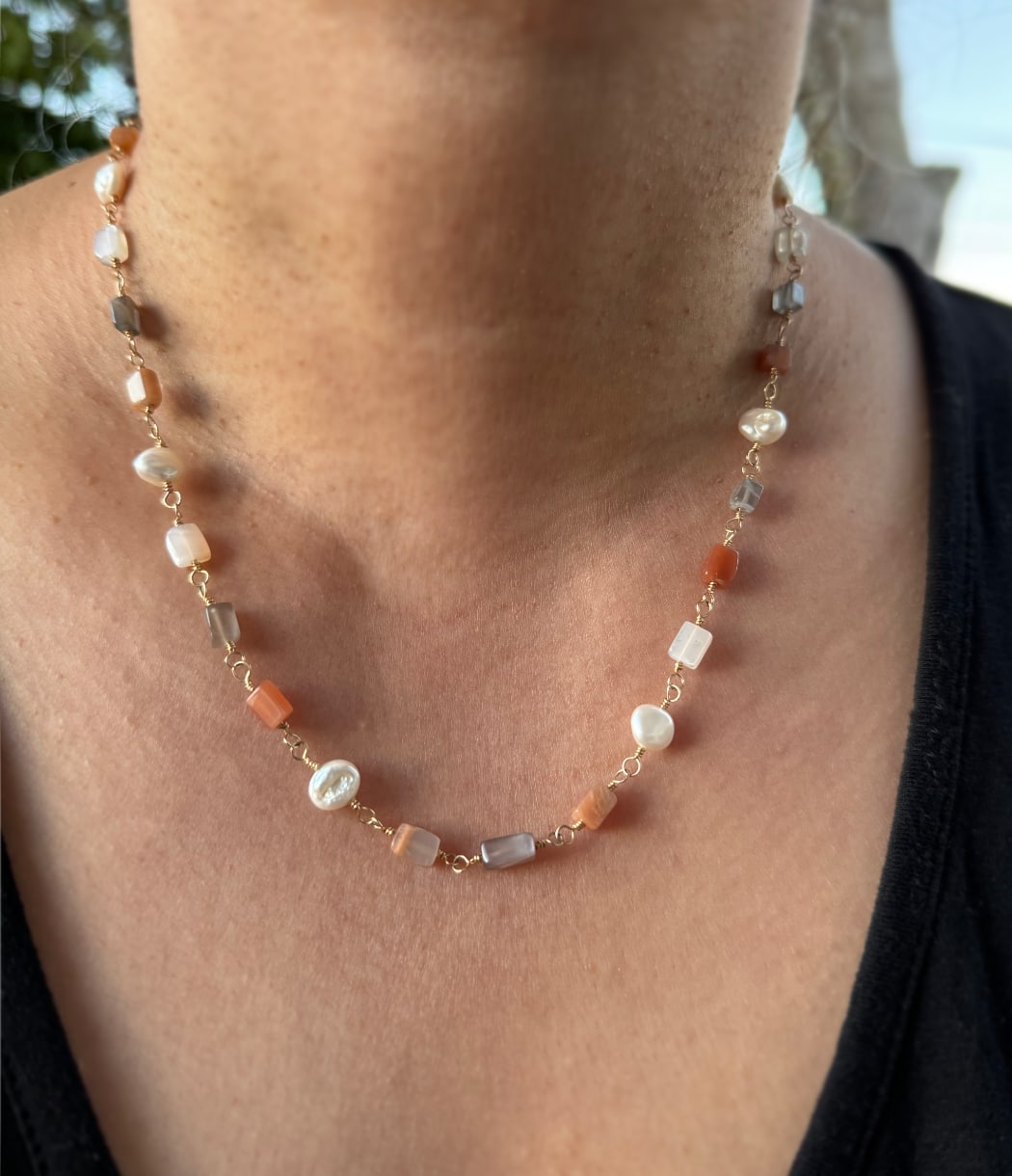 Add this beautiful dreamy necklace to your collection! Features cube shaped moonstones and baroque pearls. Each stone was hand wrapped with 14k gold filled wire and thoughtfully put together. 14k gold fill lobster clasp and has chain at the end to be clasped at any point between 17.5 - 19.5 inches. Jump rings are welded closed for quality and durability