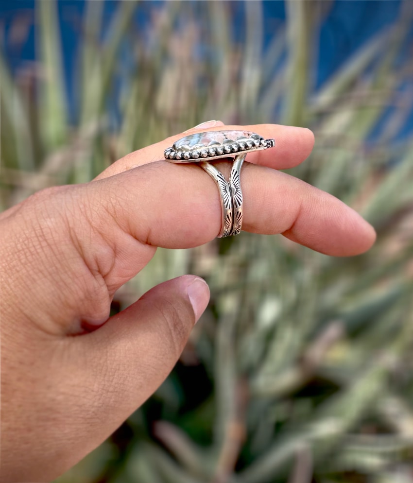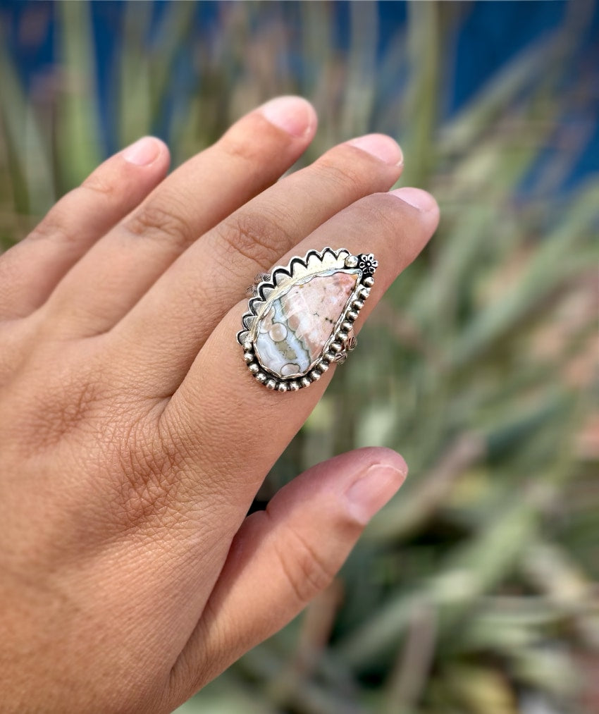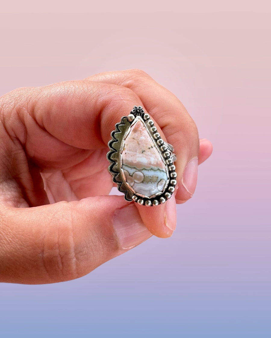 This handmade ocean jasper ring features a natural stone with dreamy orbs and earthy swirls. It is adorned with beaded and scalloped details, and a little hand forged flower on the top. Hand stamped double shank ring band. Such a beautiful beachy vibe boho statement ring! Perfect for the statement ring lovers of artisan gemstone jewelry, this piece brings coastal charm and timeless style to your collection.