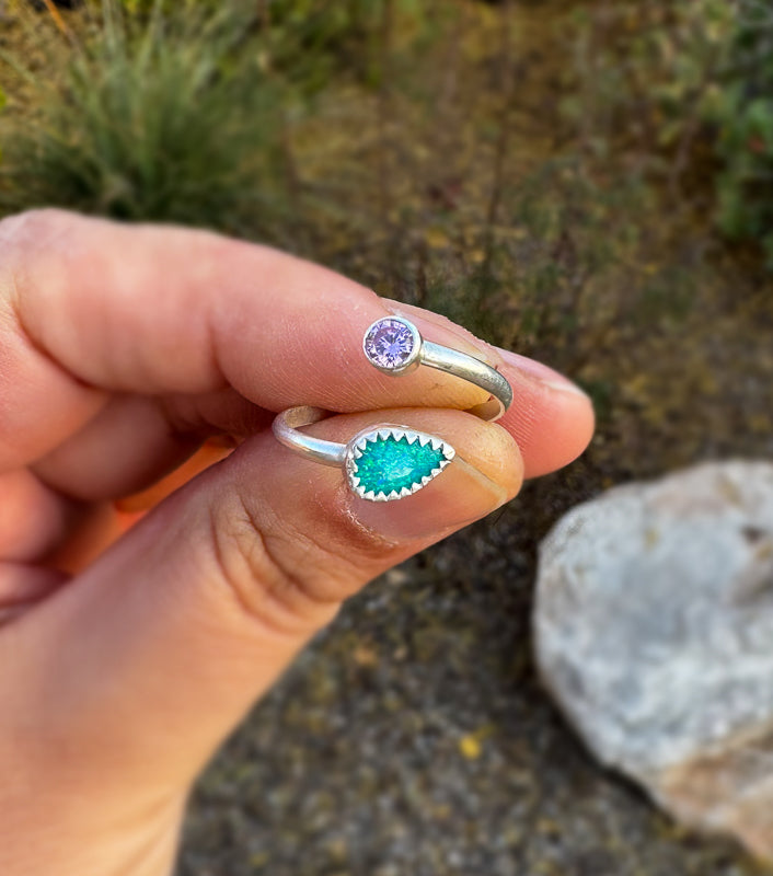 Super fun and colorful wrap ring! These open band rings, crafted with shimmery teardrop shape Australian opal doublets and round pink cubic zirconia, are becoming a favorite ring. They are adjustable due to the open wrap style - gently squeeze to ensure the right fit. Can fit size 8 to 9