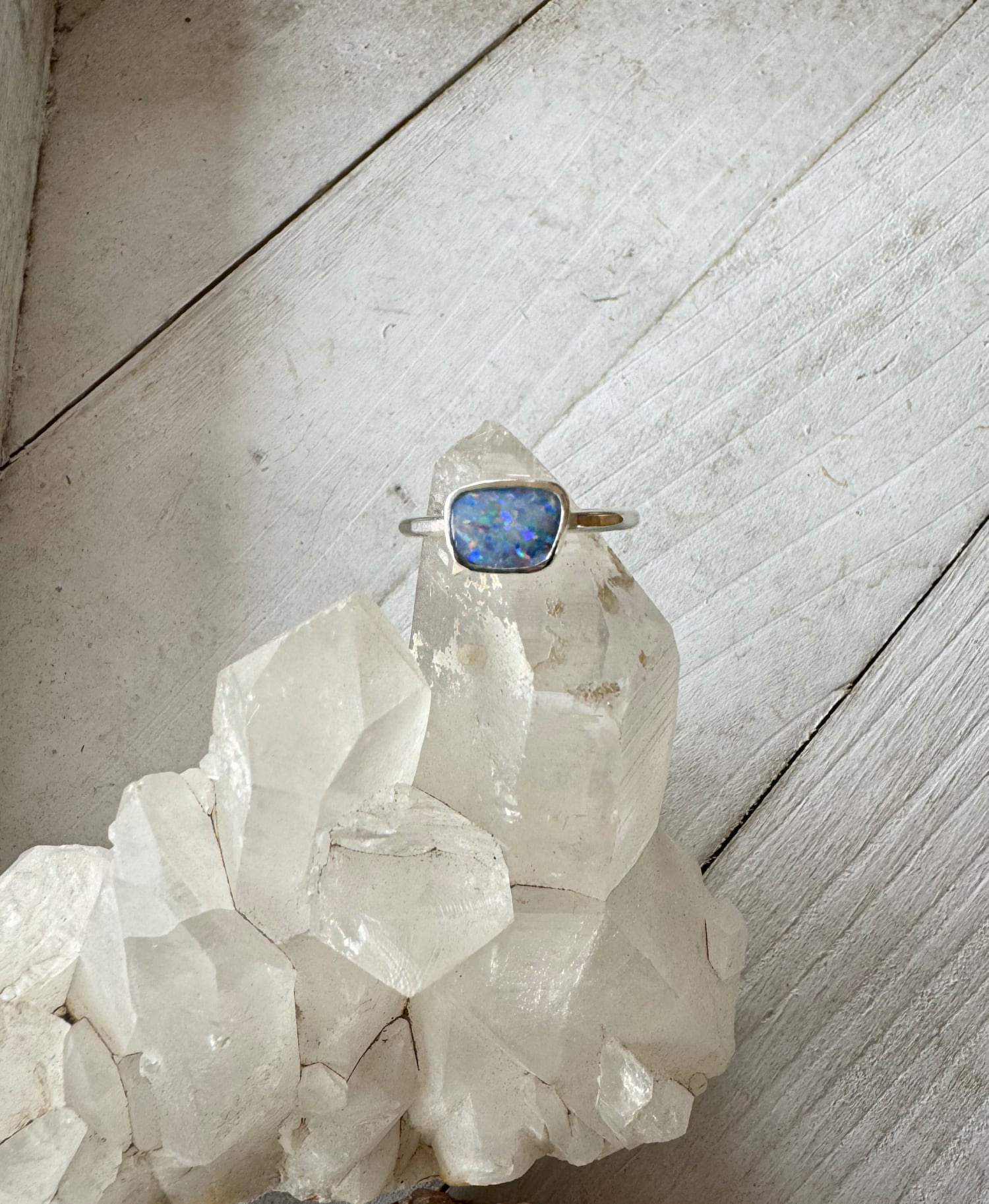 The fire on this Australian Coober Pedy opal doublet stone takes my breath away! Has a beautiful blue sparkle especially in the sunlight. This handmade ring was made from sterling silver with a lightly hammered band.