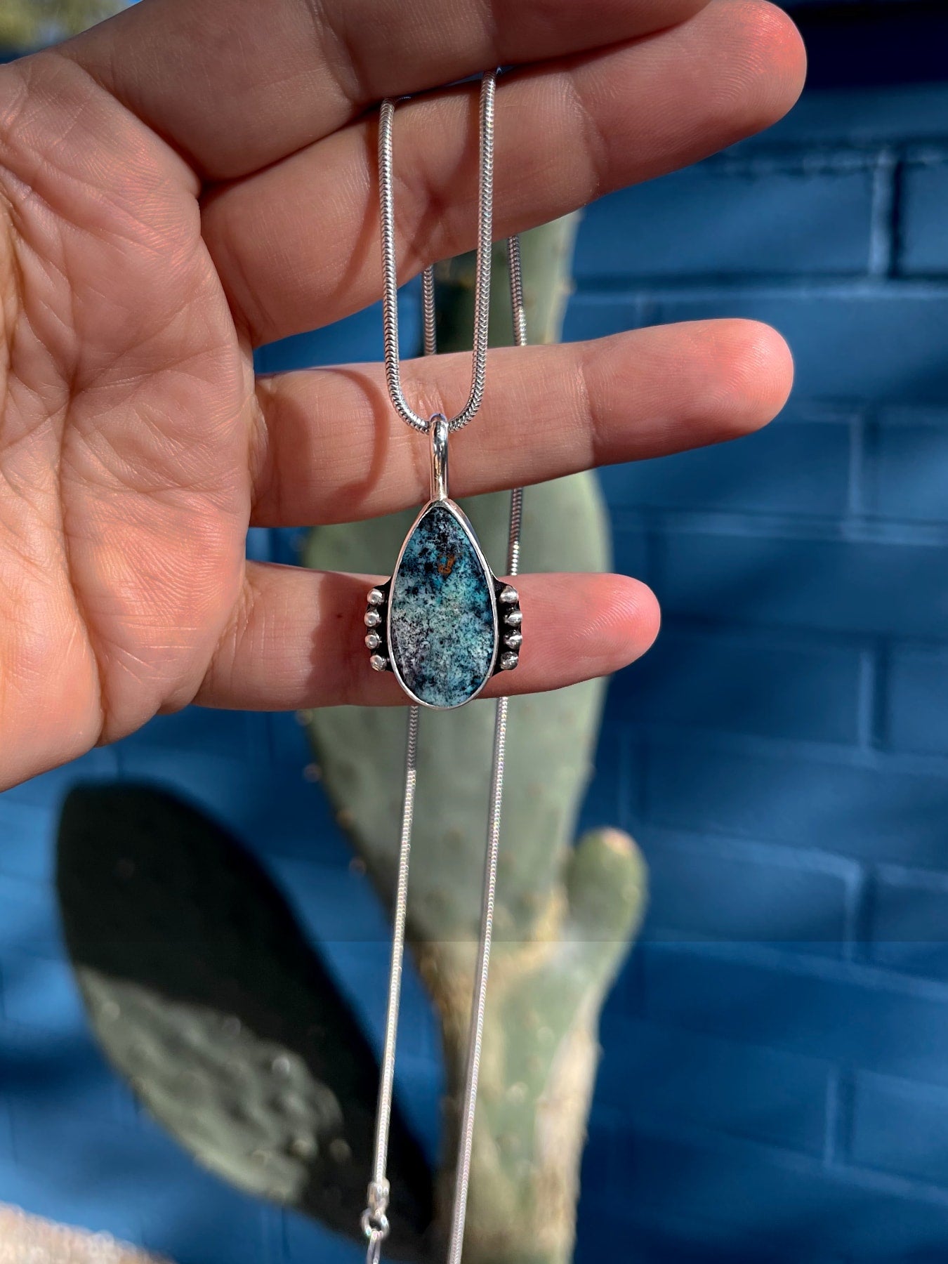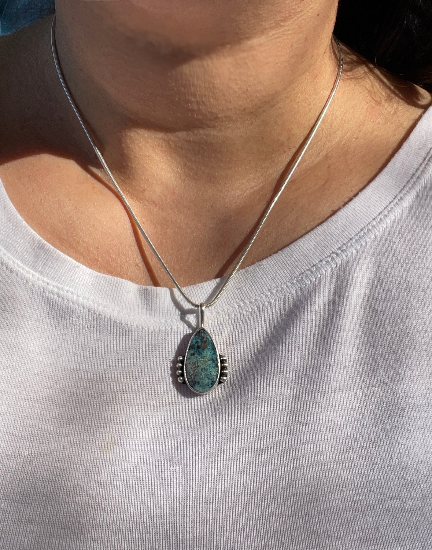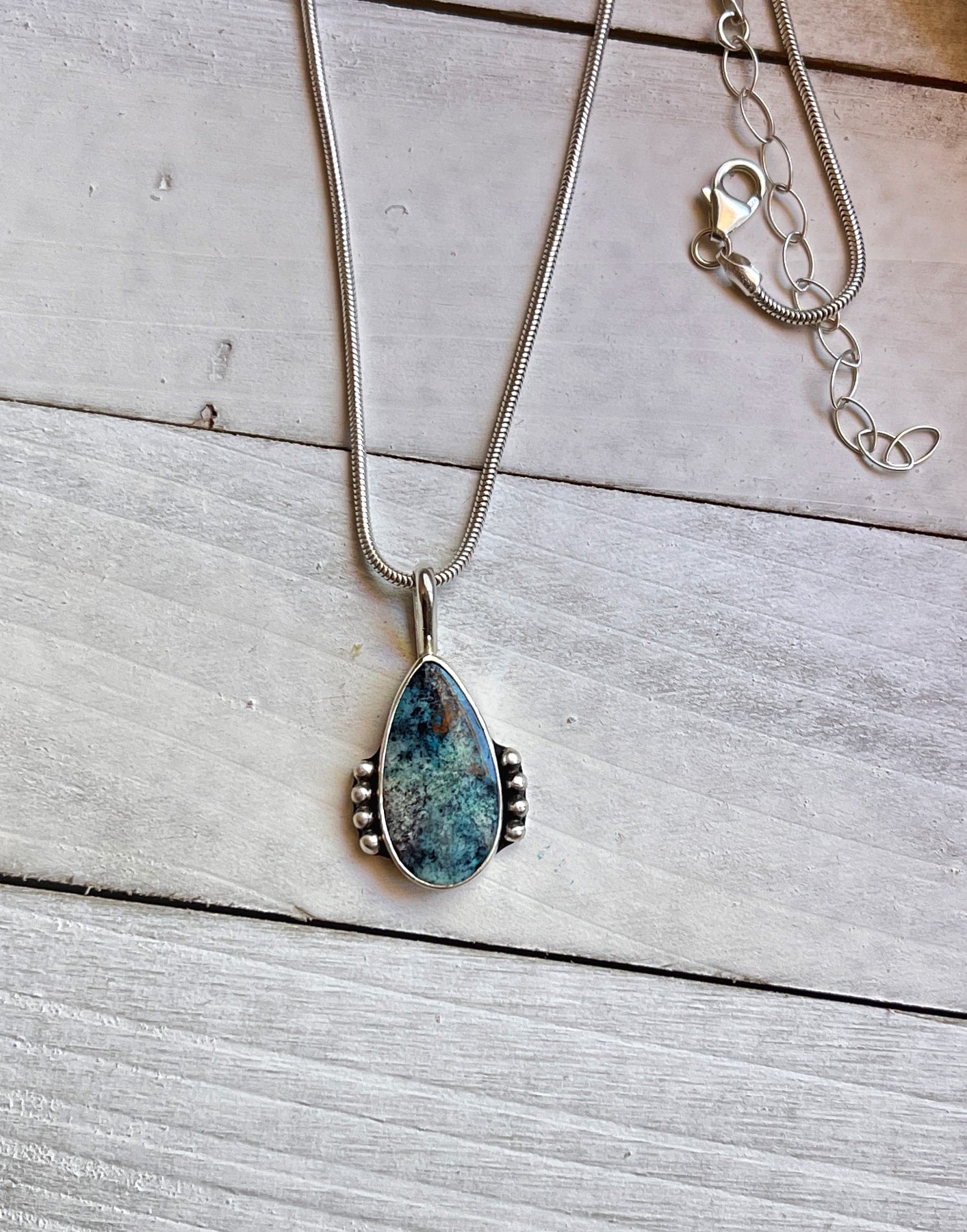 The color on this opalized petrified wood stone is so beautiful. The teardrop shape is said to symbolize the idea of letting go of the past and embracing new beginnings. Hangs on a sterling silver snake chain. Chain is 18 inches and includes a 2 inch extender chain for a maximum length of 20 inches.