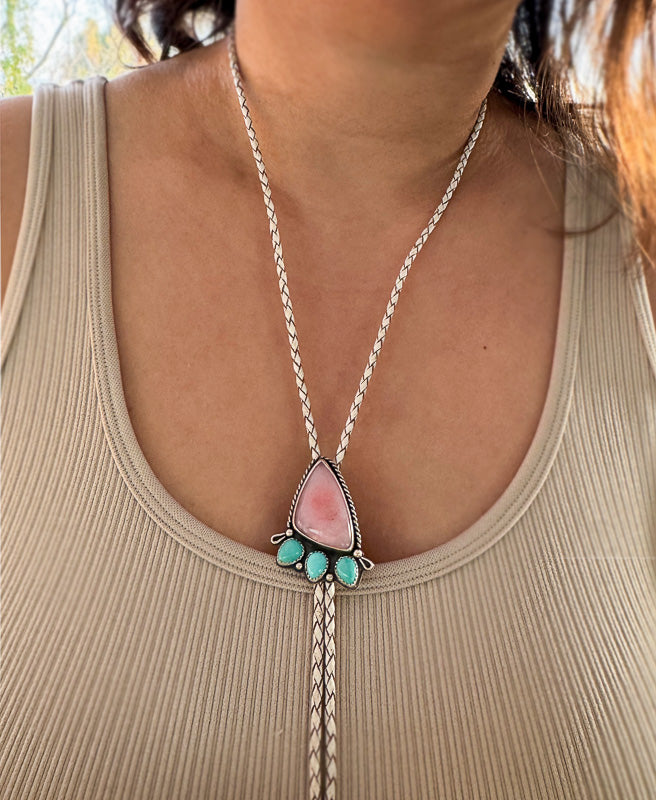 This handcrafted bolo tie features an asymmetrical pink opal stone, beautifully accented with three vibrant turquoise stones. Set on a 3mm white braided leather cord, it’s finished with handmade bolo tips for a modern and polished look. This slides up and down on two loops on the backside, and stays where you want it to sit. Wear it higher up on the neckline or lower down. This is a standout charming bolo!