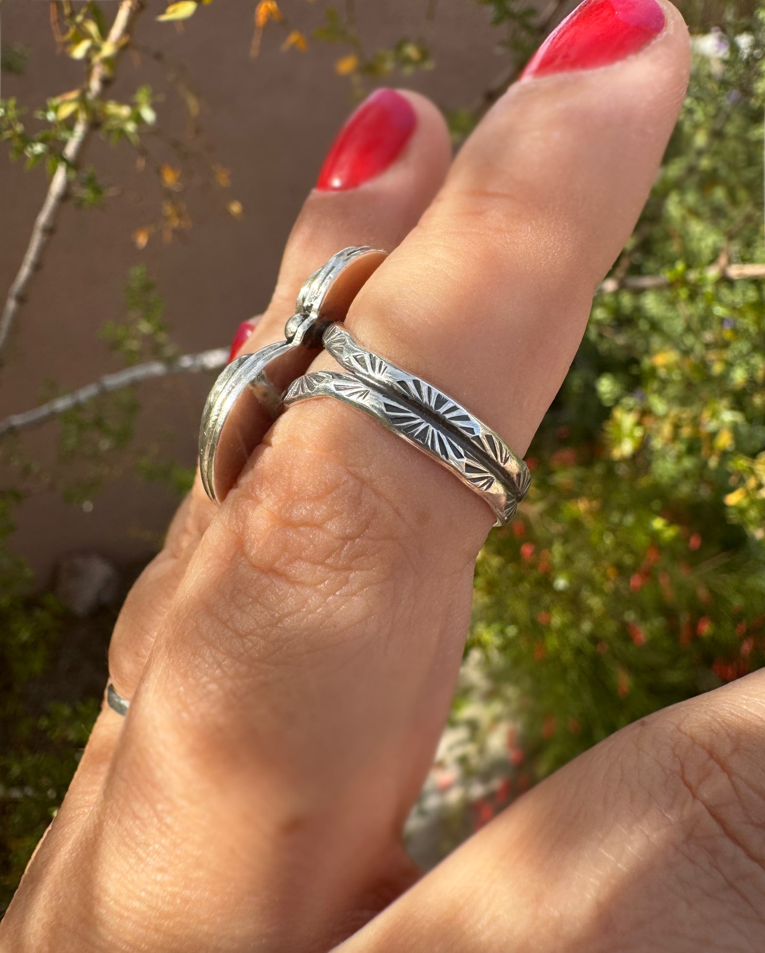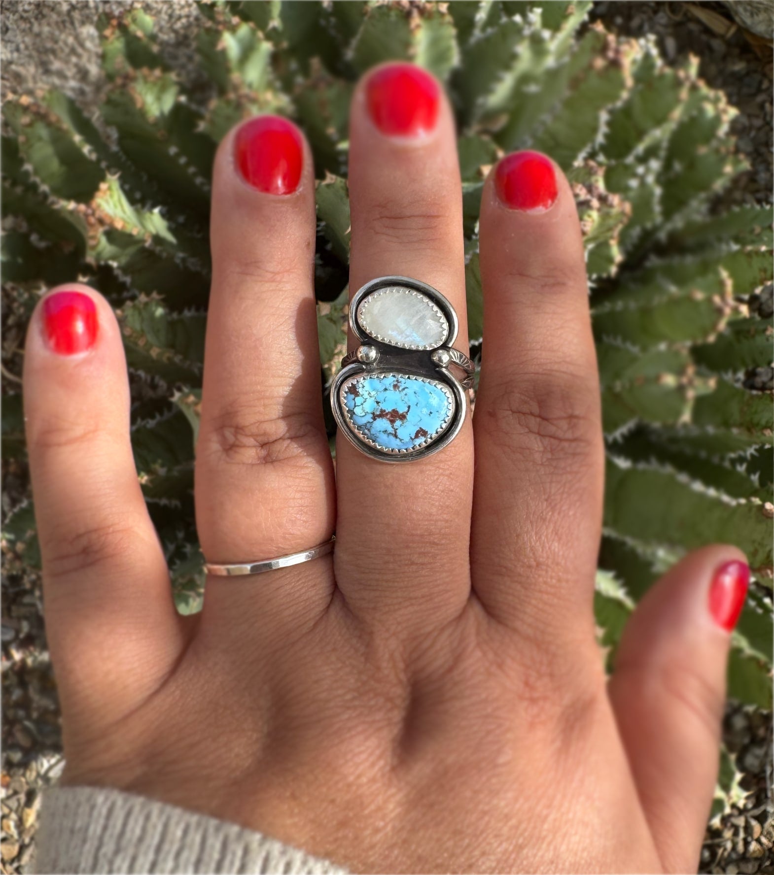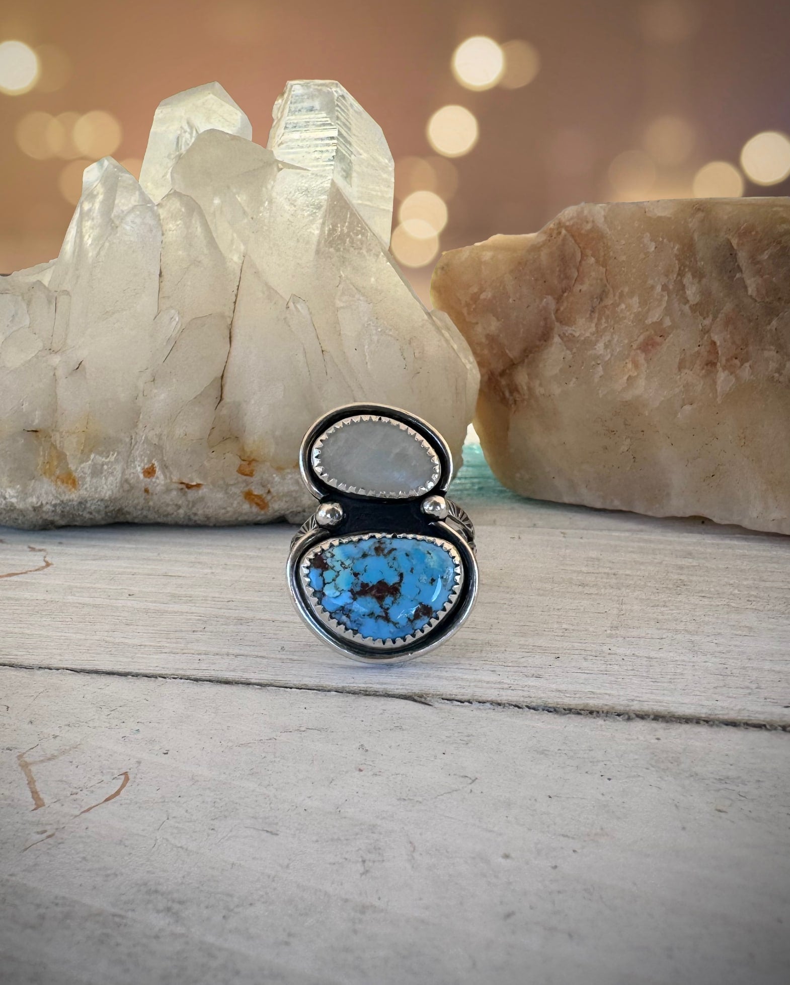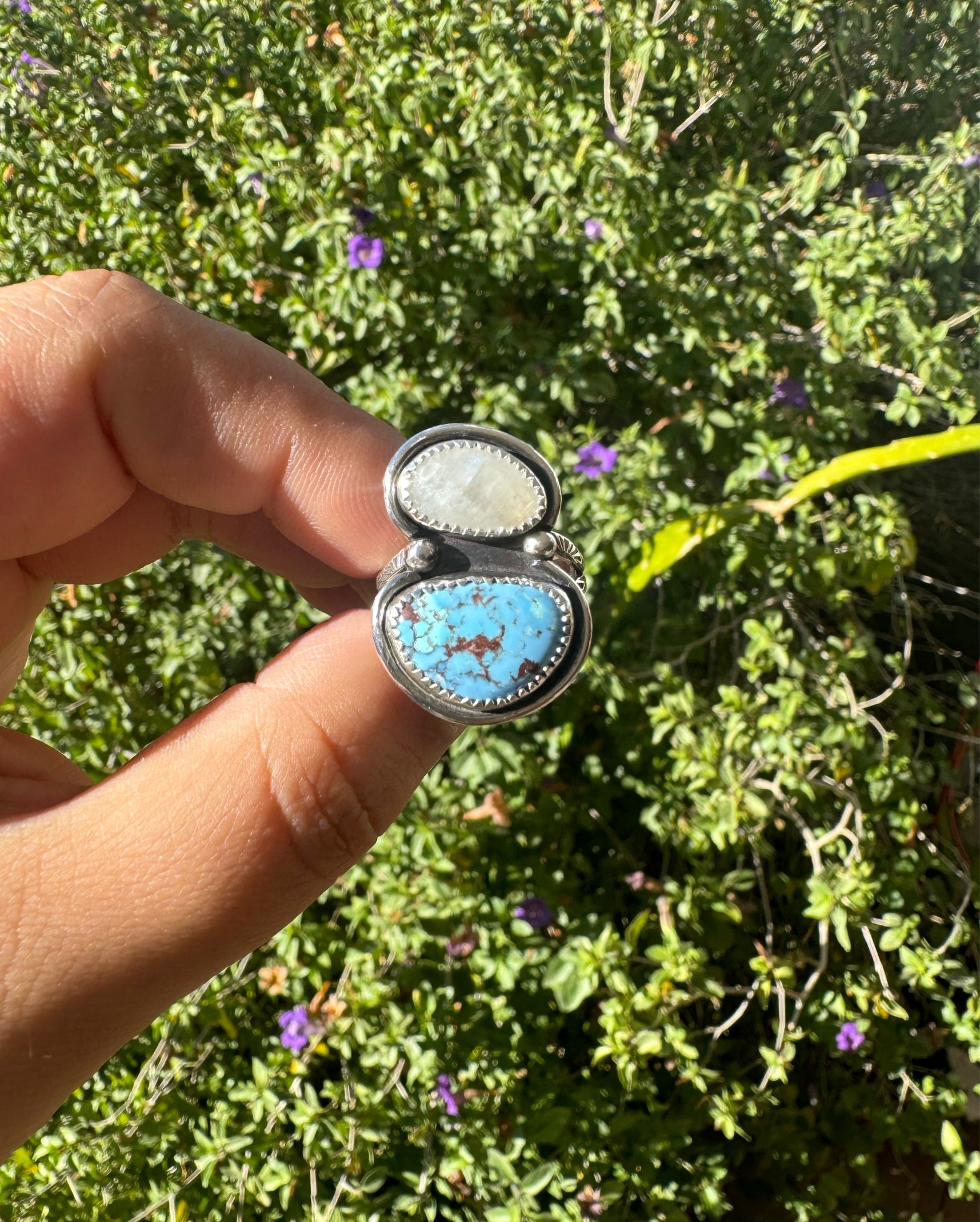 This statement ring features a golden hills turquoise on bottom and a faceted rainbow moonstone on top. Sterling silver wire and balls around the stones frame this stunning ring. Handstamped split ring band.