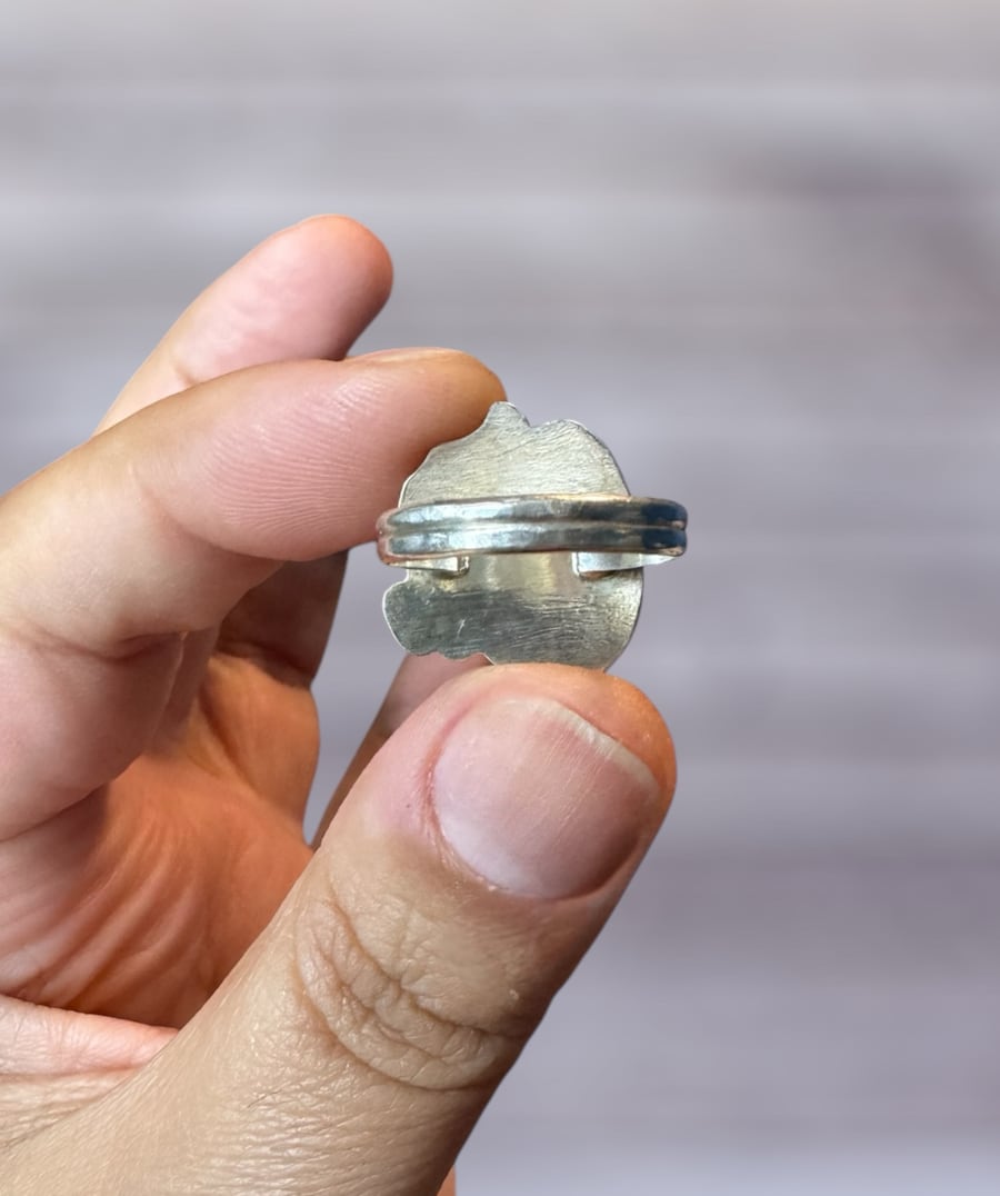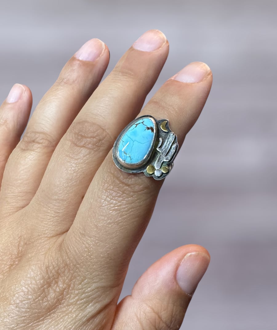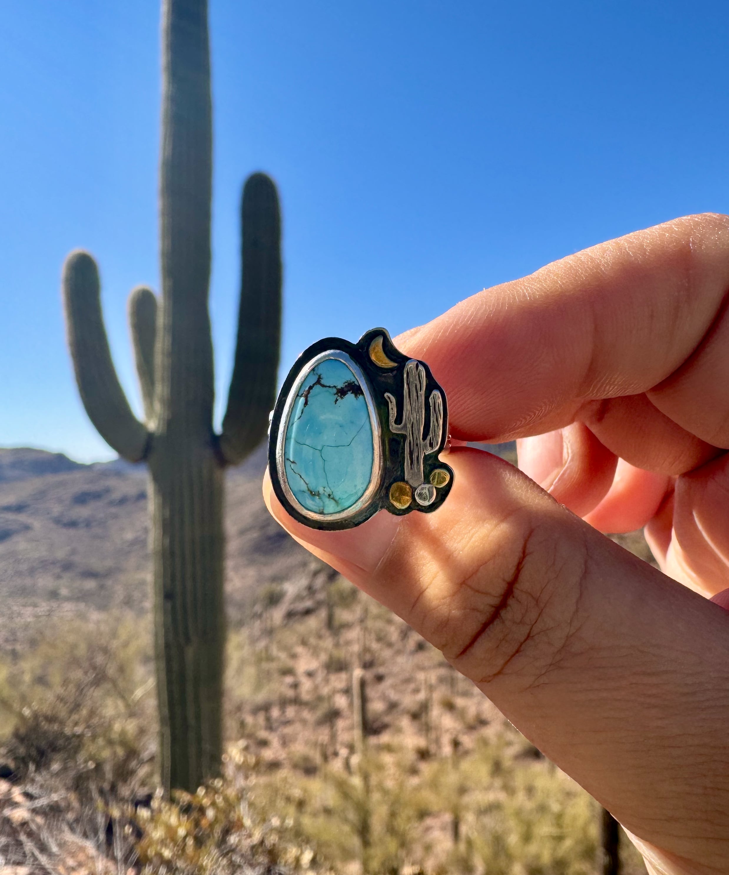 This ring was inspired by the beauty of the Sonoran desert and the magnificent Saguaro cactus. Featuring a stunning sky blue golden hills turquoise stone, set in oxidized sterling silver to enhance its depth and character. A hand-sawn saguaro cactus, accented with brass details and a tiny crescent moon, adds a dreamy desert touch.