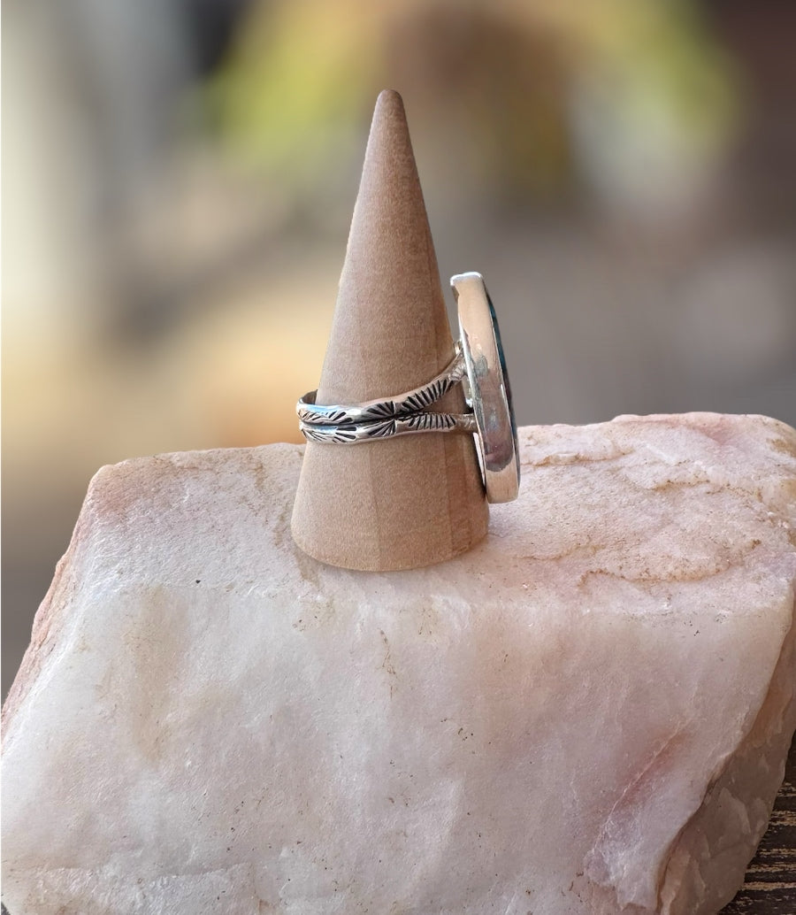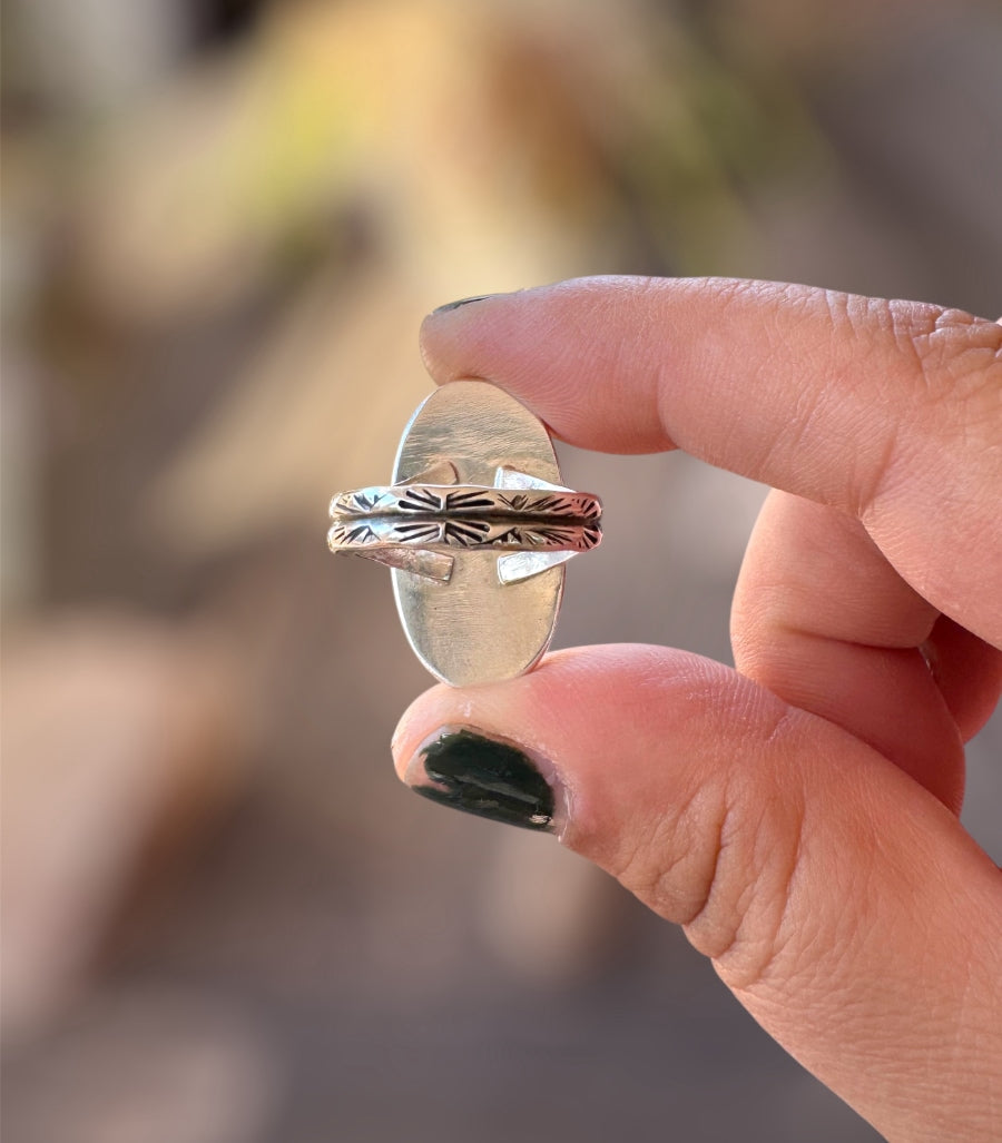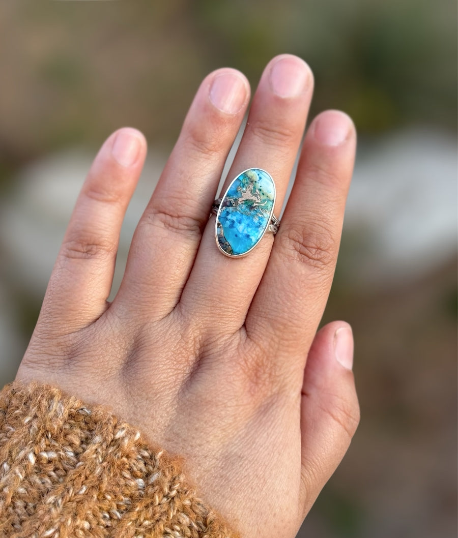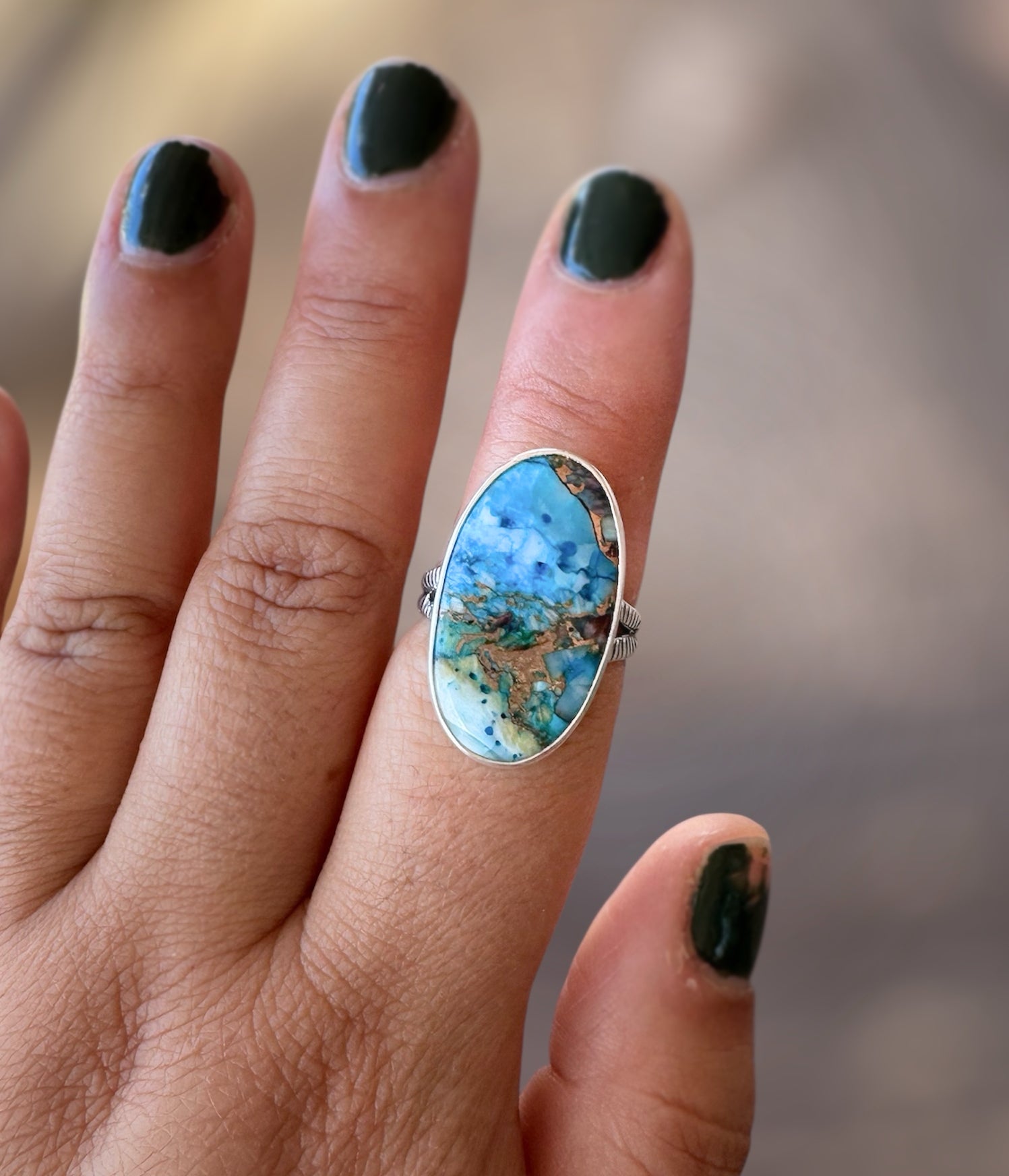 This striking ring features a composite stone of turquoise, bronze, and white buffalo, resembling the beauty of an ocean shore. Its vibrant colors make a bold statement, while the handstamped split ring band adds a unique touch.