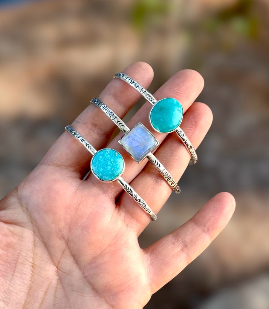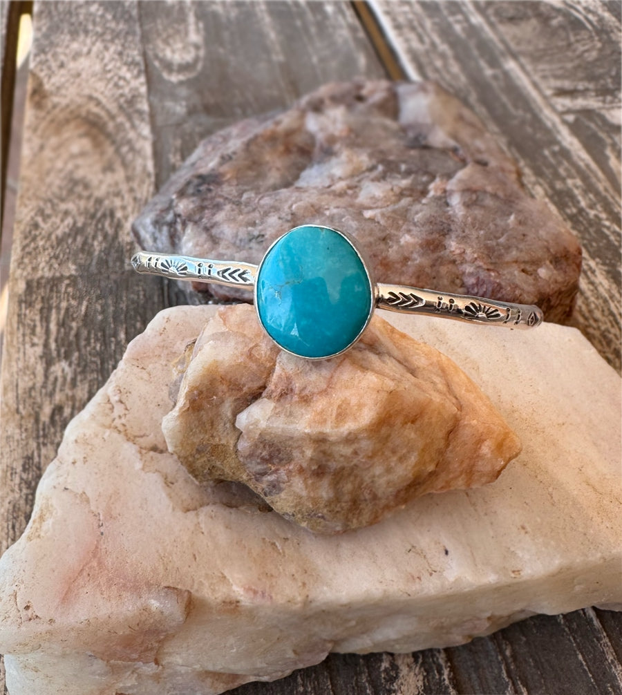 This turquoise was meant to stand out! The band is hand stamped - a true classic turquoise cuff with a modern look! Wear it solo or stack it with other bracelets! The entire cuff is about 6 inches around with 1.25 inch opening.