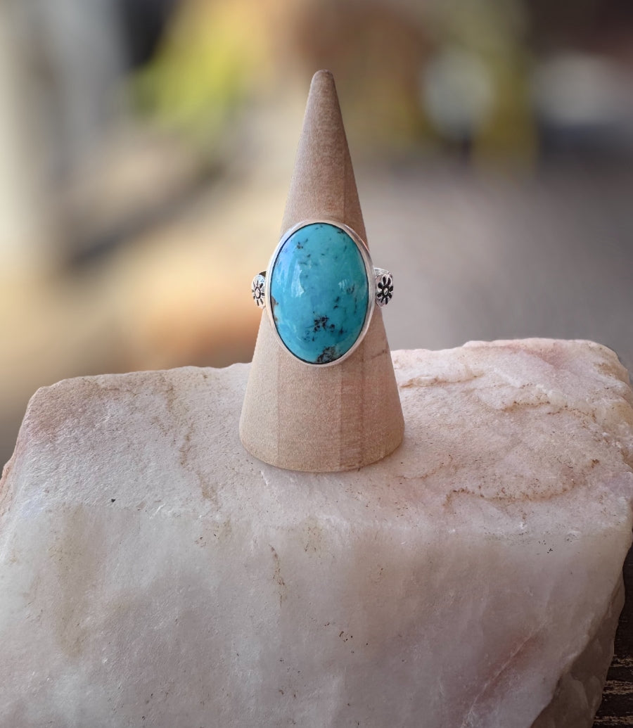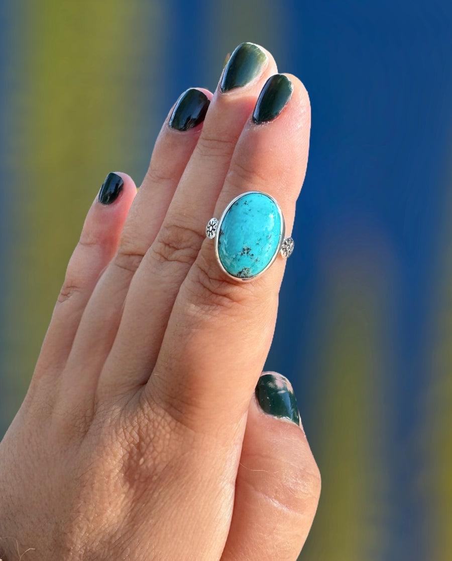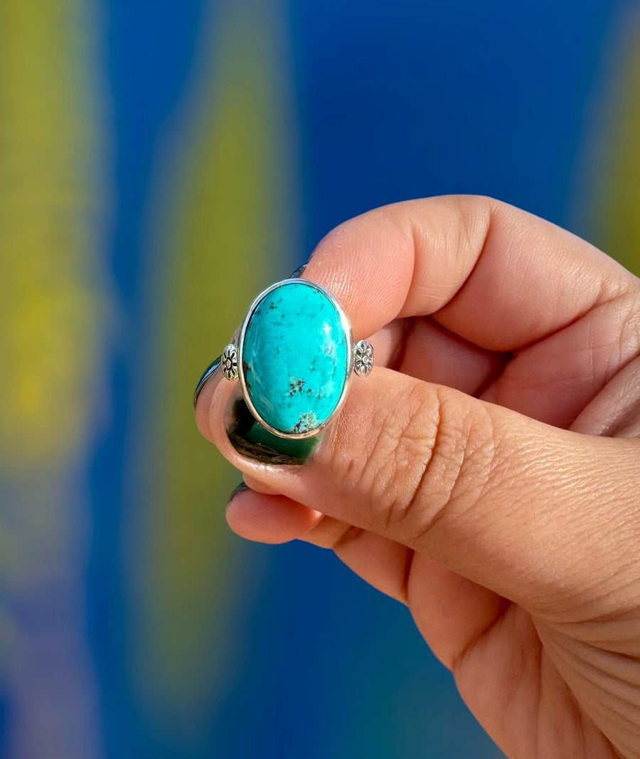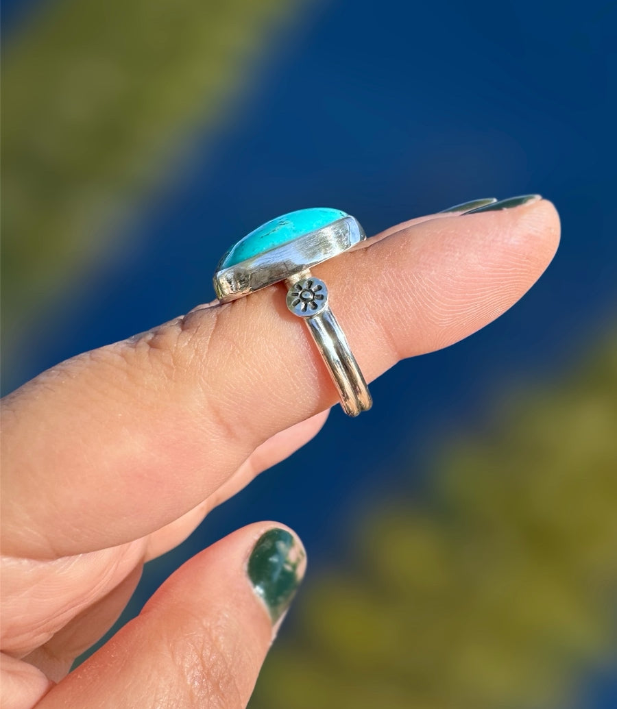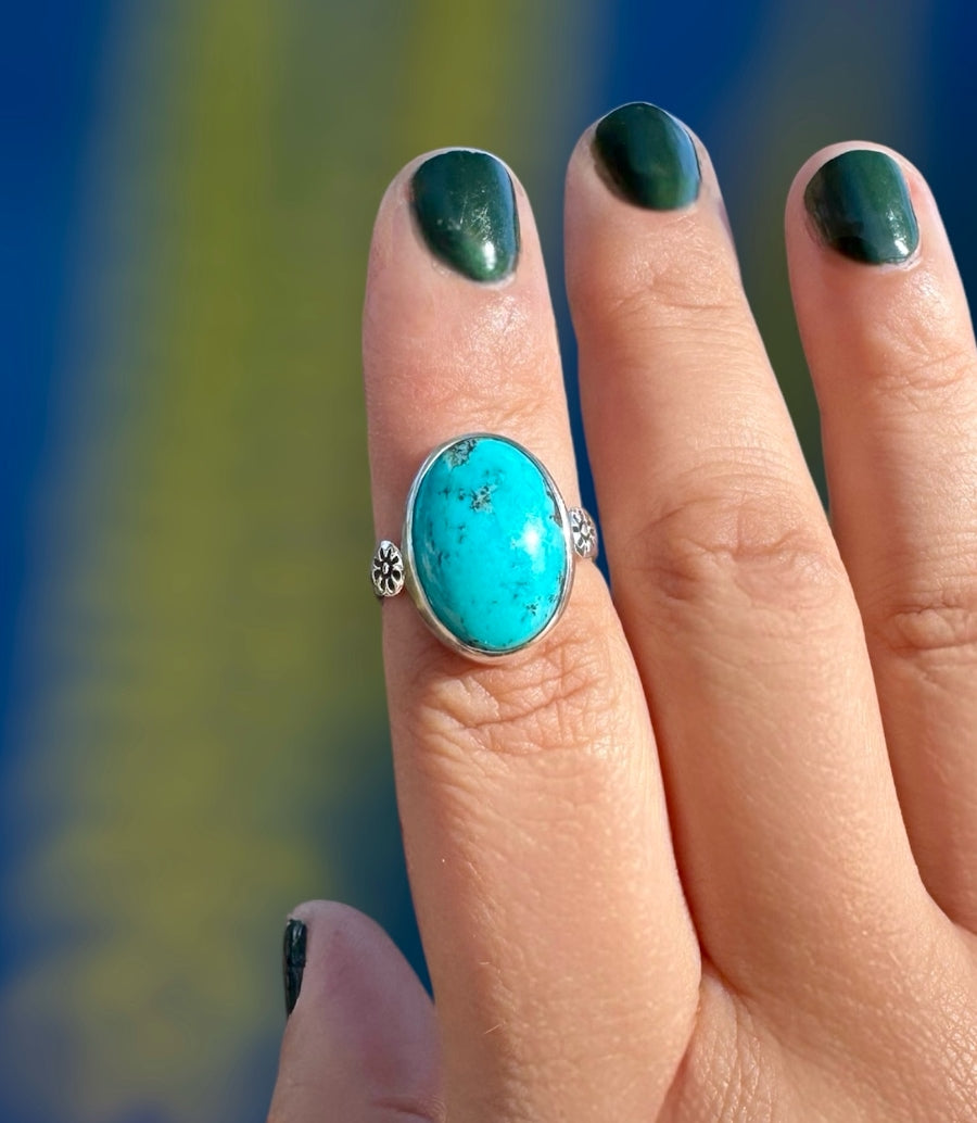 Make a statement with this turquoise ring, featuring a vibrant oval Hubei turquoise stone with natural matrix details. It is accented with hand stamped detail on each side of the split ring shank. Perfect timeless ring of Southwest charm!