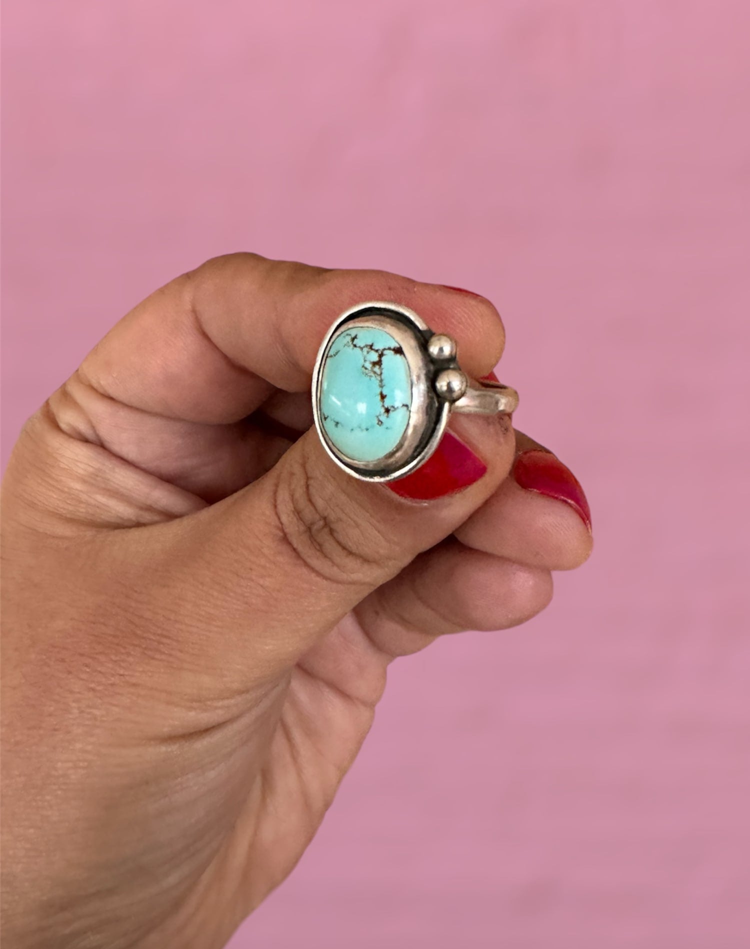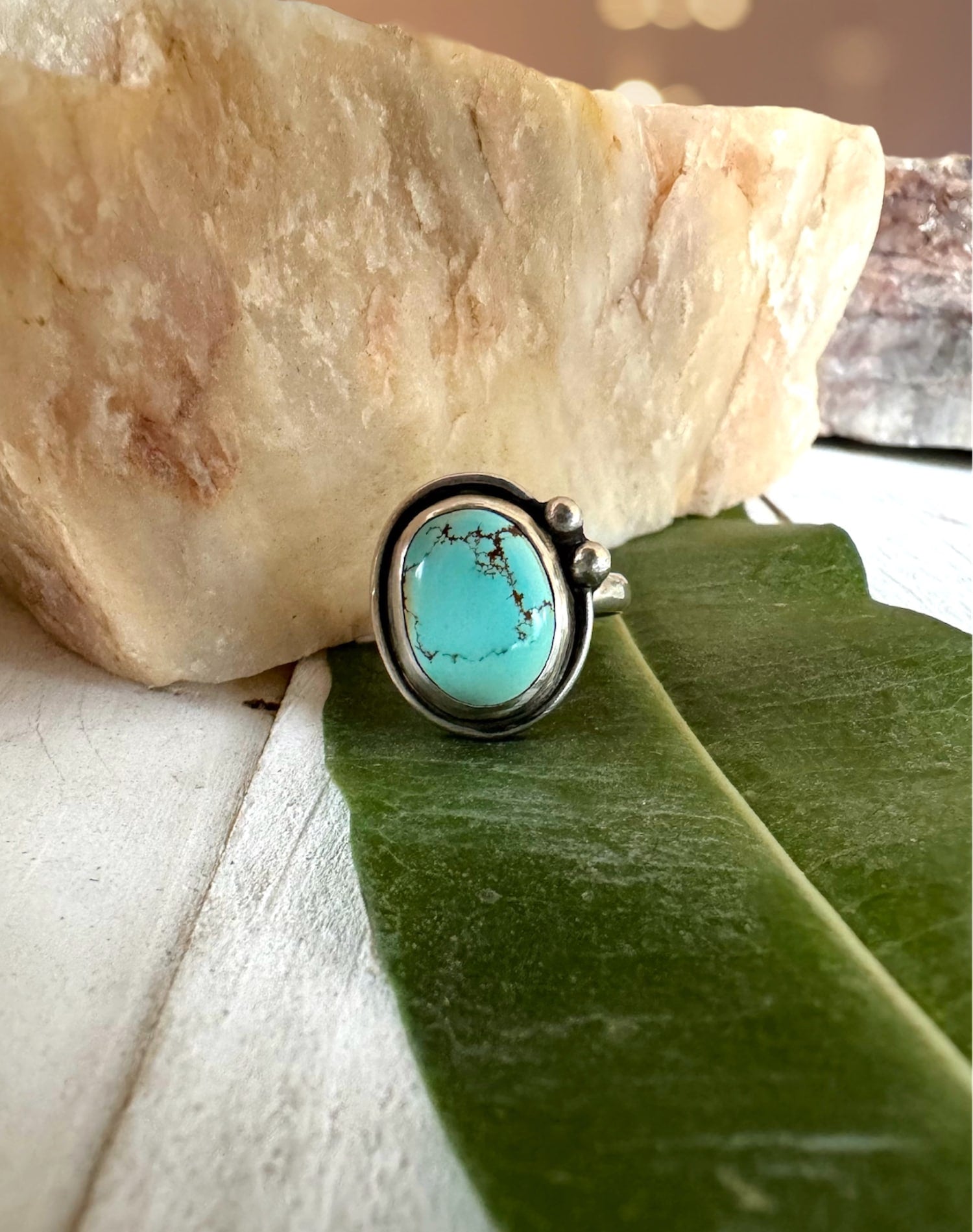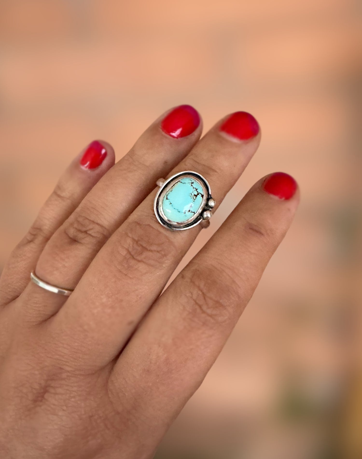 A cute golden hills turquoise stone that is a beautiful sky blue color. The setting is adorned with handcrafted details.