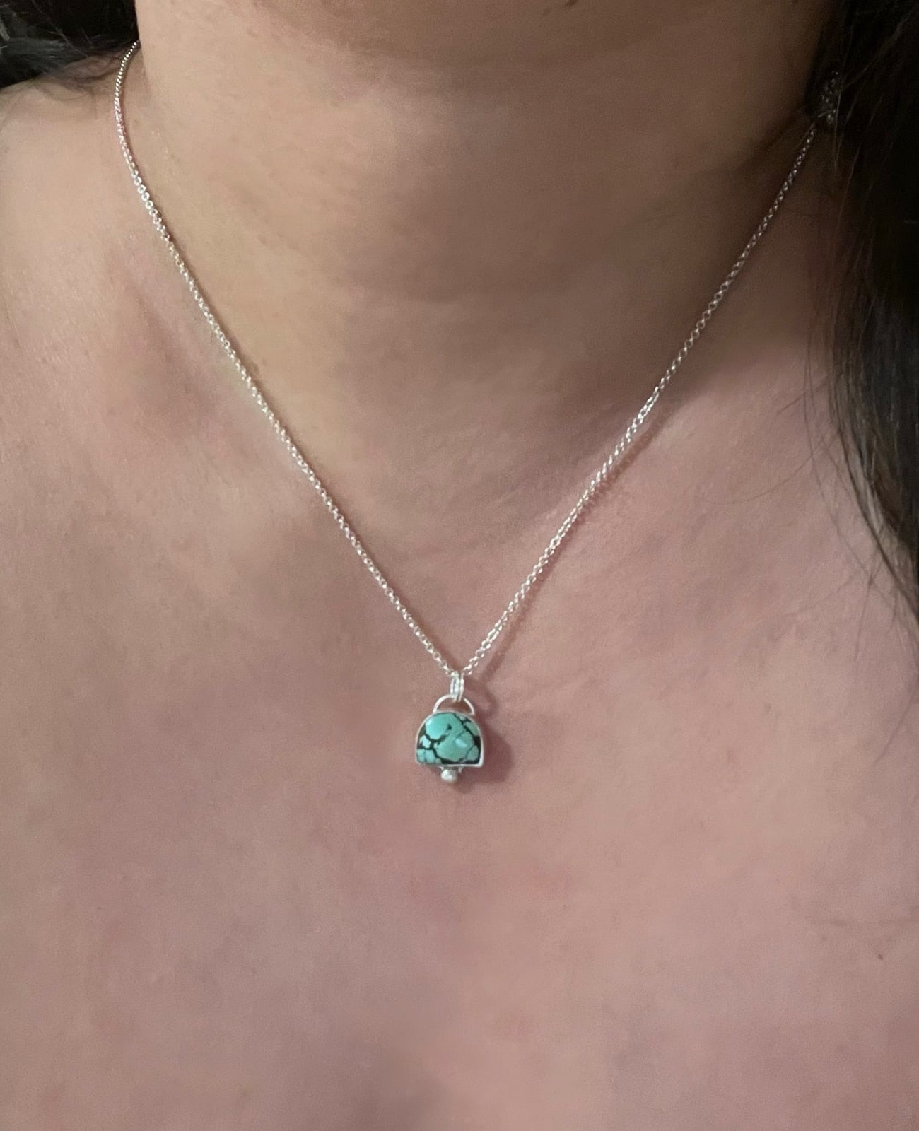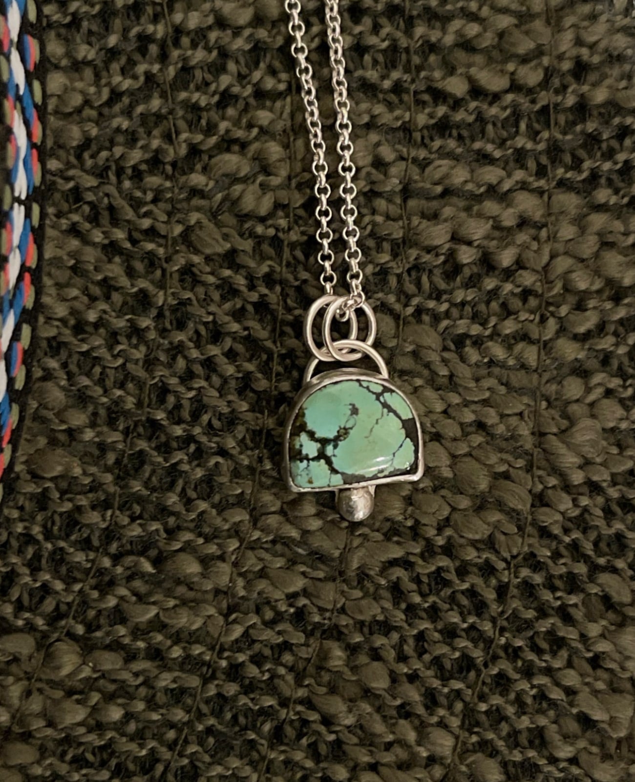 This handmade pendant features a turquoise stone set in sterling silver adorned with a sterling ball accent. Pendant hangs from an 18 inch sterling silver rollo chain.
