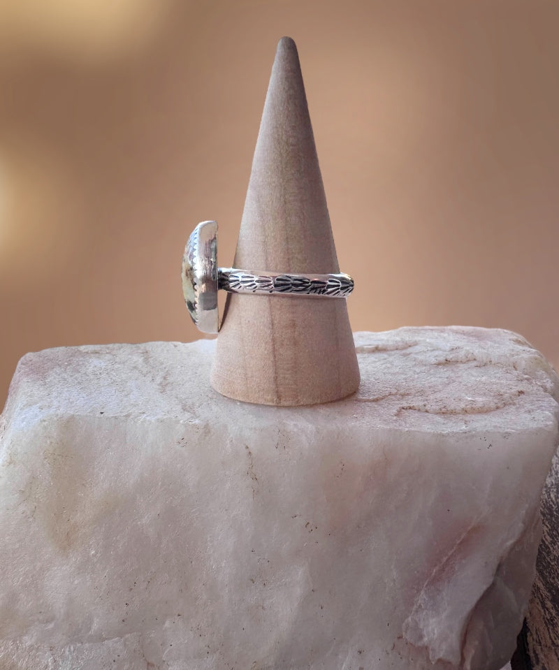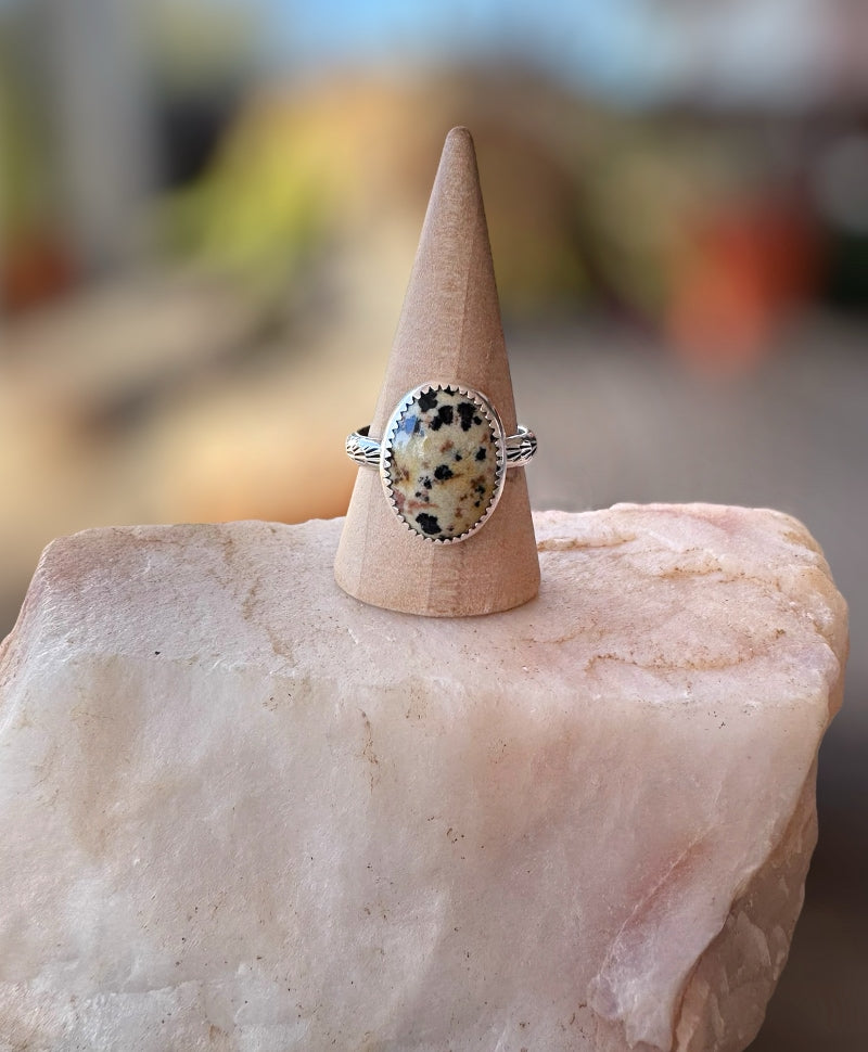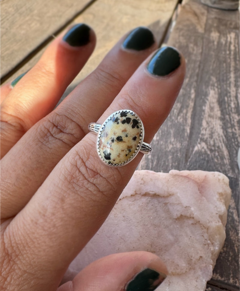 Dalmation Jasper is a naturally black and white spotted jasper, so its fun and a unique stone to wear in your jewelry! This Dalmation Jasper ring is on a 3.5mm thick handstamped band. This ring can be sized up a half size. Please leave a note upon checkout.