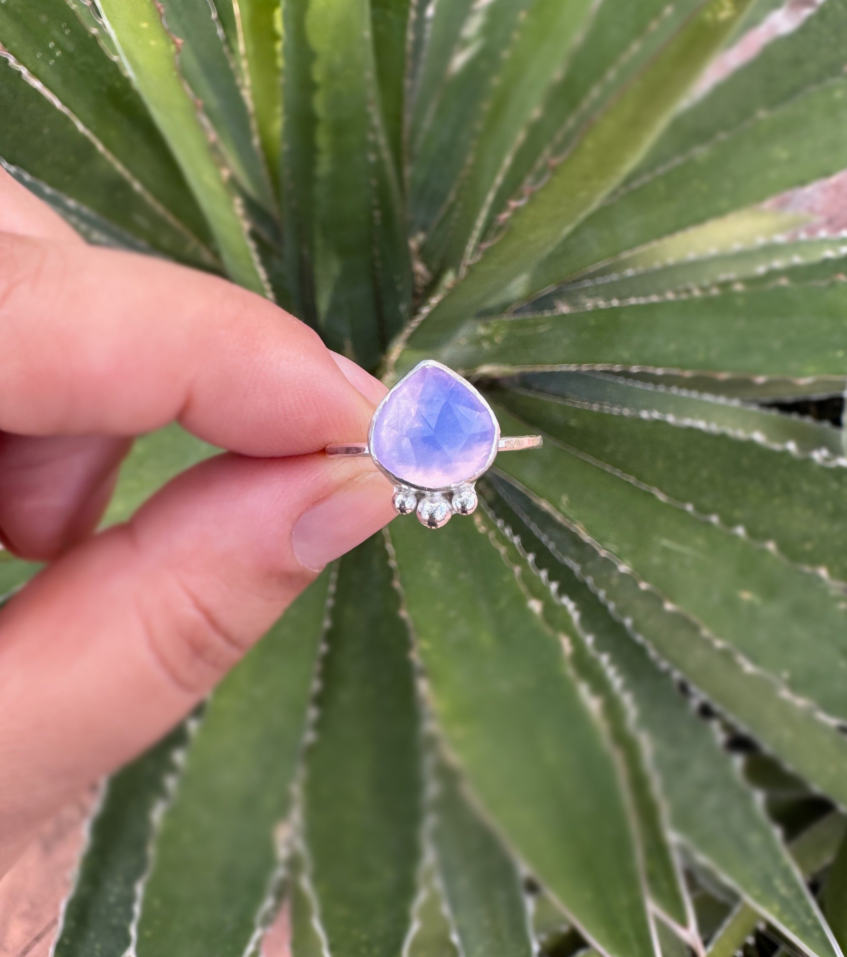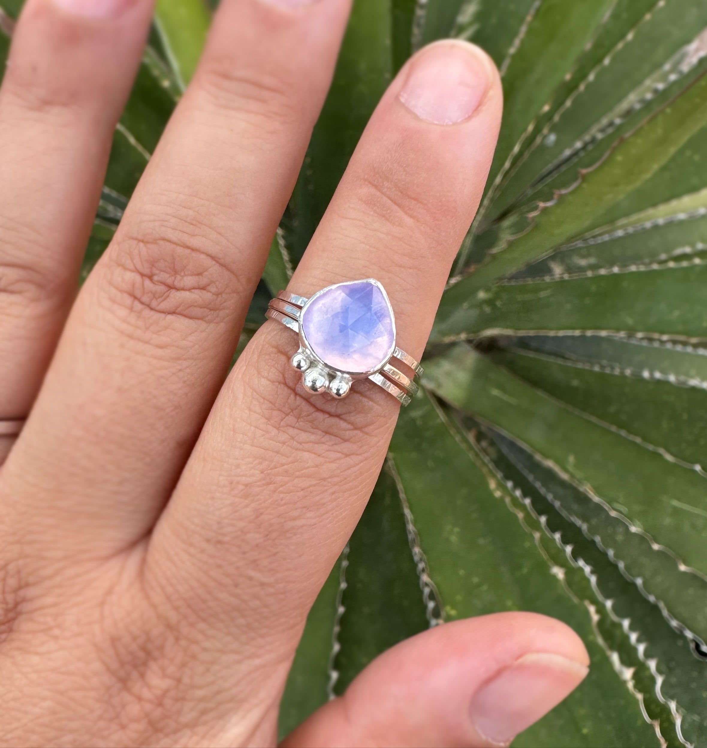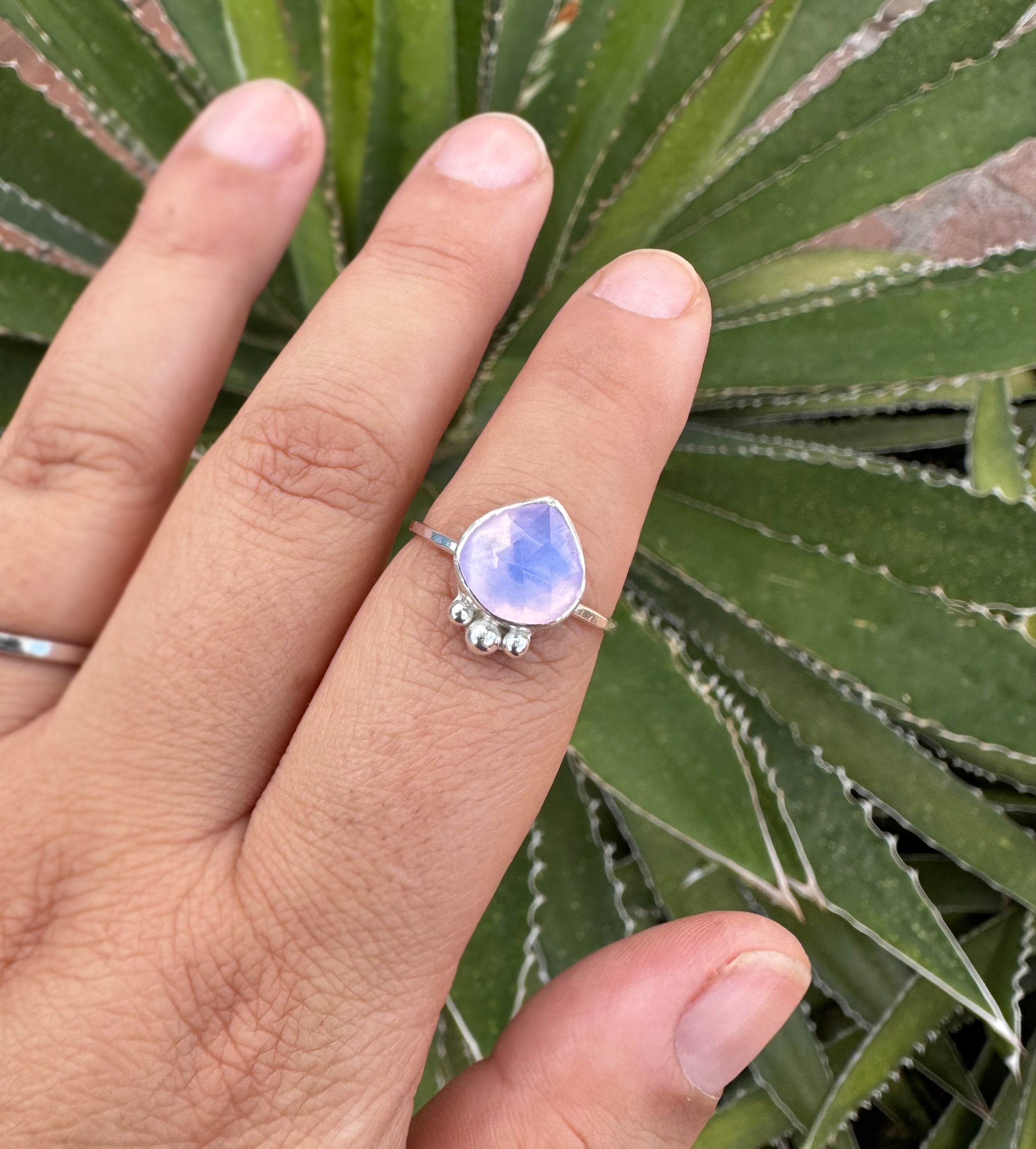 This dreamy ring features a faceted lavender moon quartz set in a teardrop shape. The soft lilac glow of the stone shifts beautifully in the light, giving it an ethereal, calming presence.