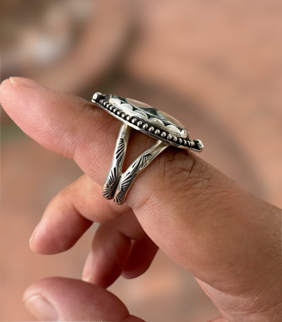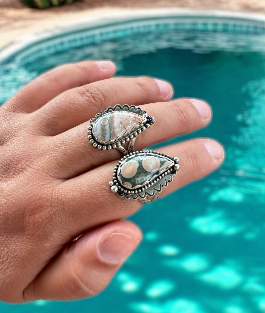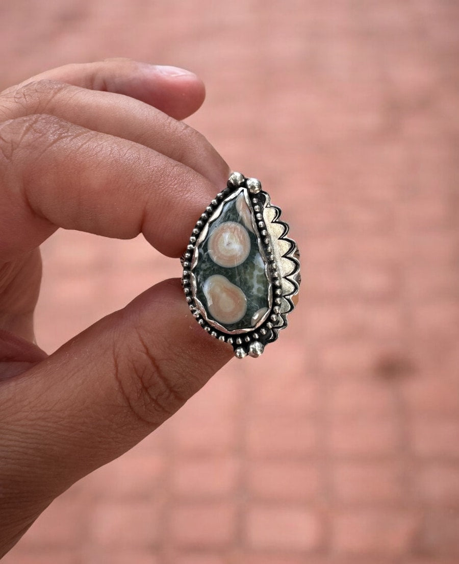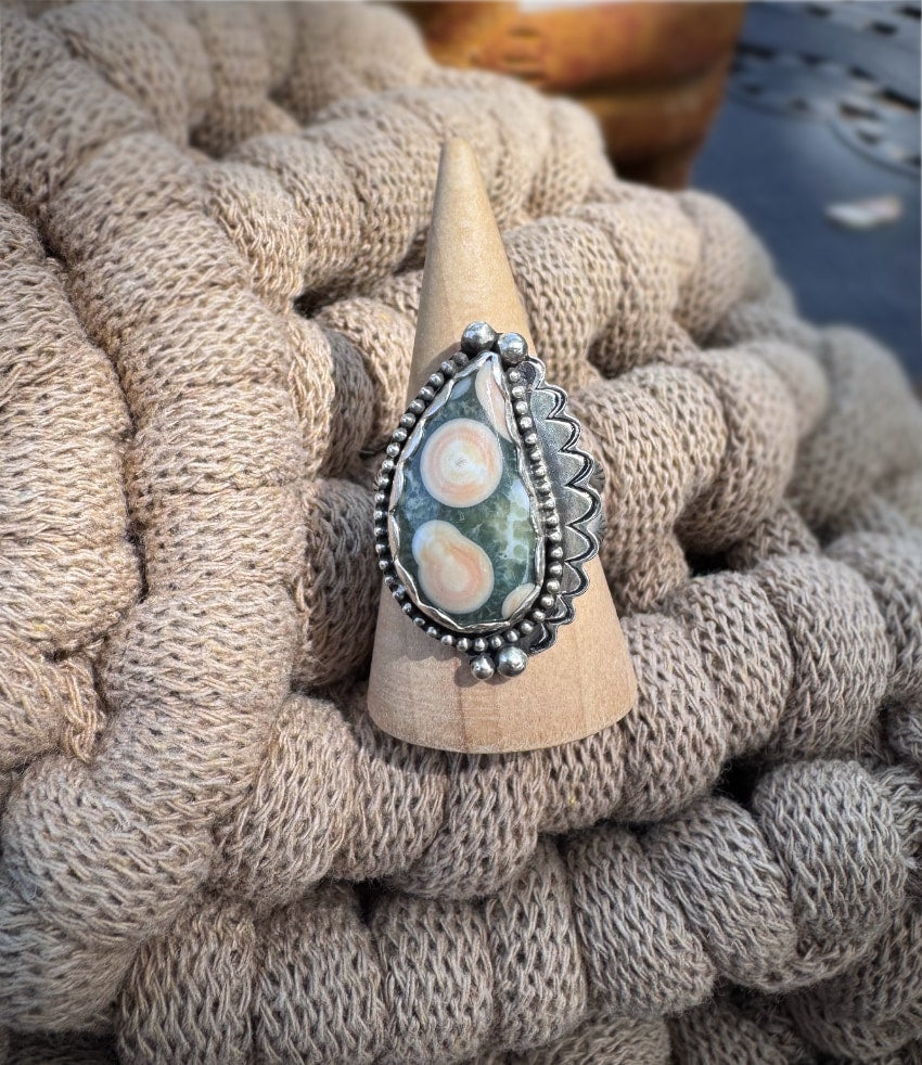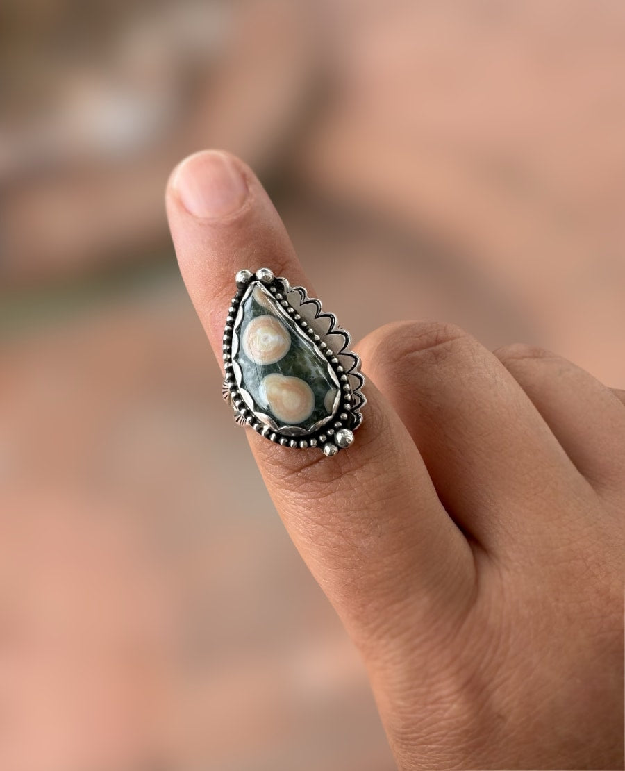 This handcrafted ring features a stunning teardrop paisley shaped ocean jasper stone. The stone has such a cool unique shape and the natural orbs remind me of tiny tidepools, captured in silver. Set in a detailed sterling silver scalloped bezel with handstamped and forged accents, it’s a statement ring made to turn heads and spark curiosity!