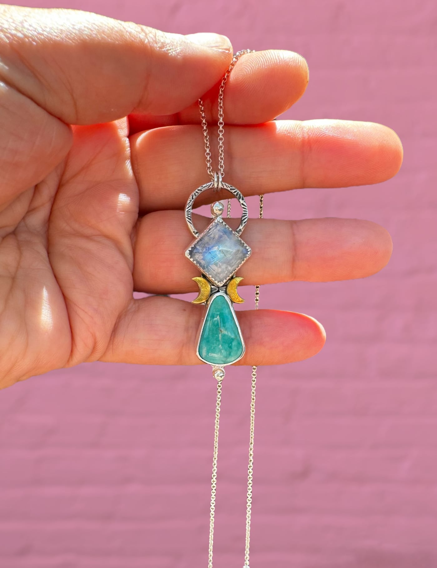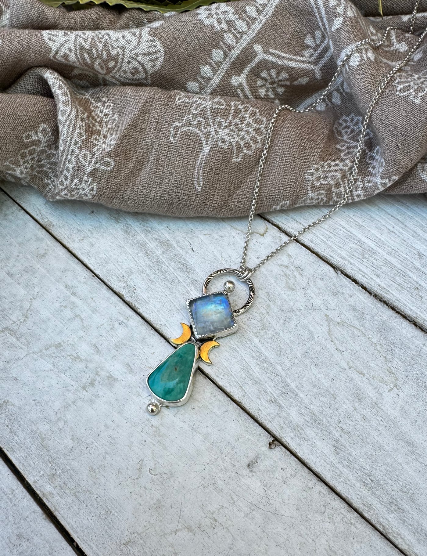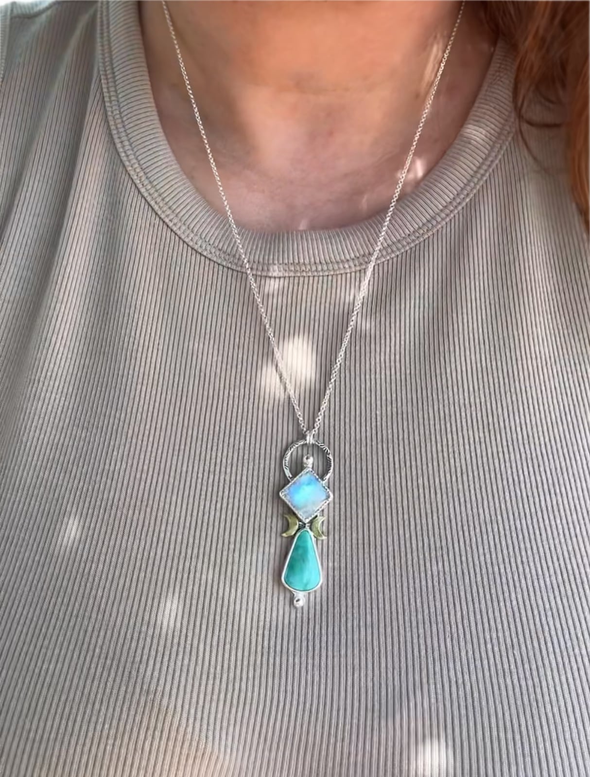 Unveil the ethereal beauty of this handcrafted necklace featuring a mesmerizing rainbow moonstone and a serene turquoise drop. Set in a unique design with hand cut brass moons and sterling silver accents, this piece captures the beauty of the celestial and the tranquility of nature. It is perfect for adding a touch of mystical charm to any outfit! Longer chain is 21.5 inches in length.