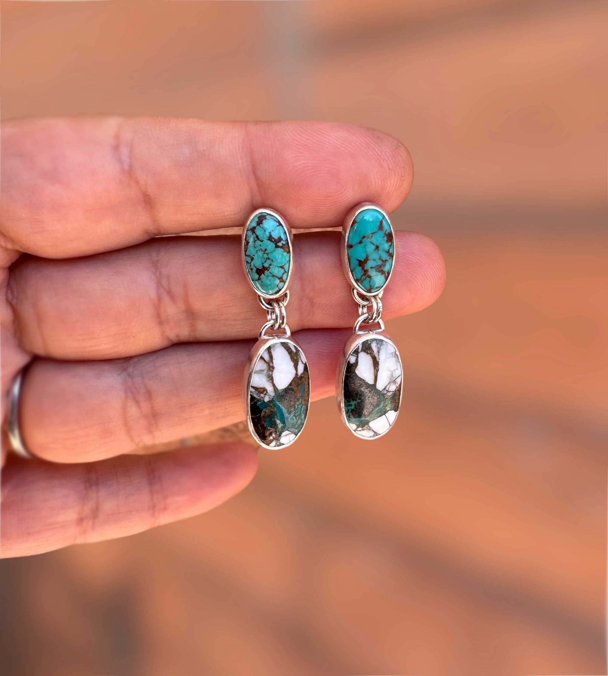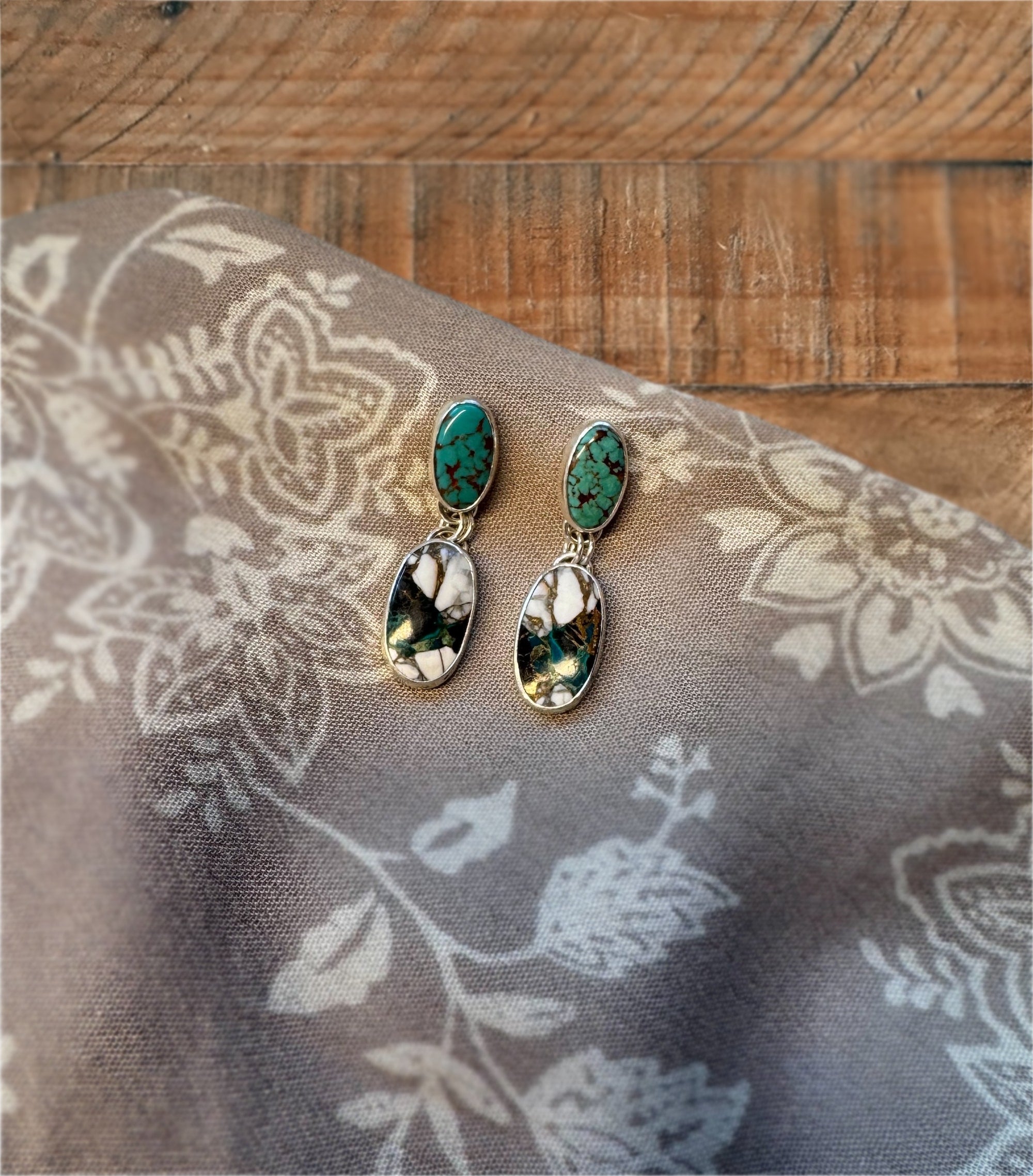 The top stones feature some really gorgeous deep blue-green turquoise, while the bottom stones are a mosiac of white buffalo and turquoise, with copper veins that remind us of the earthen desert.  These unique stones make for a real one of a kind pair of earrings.