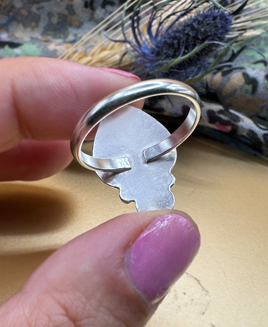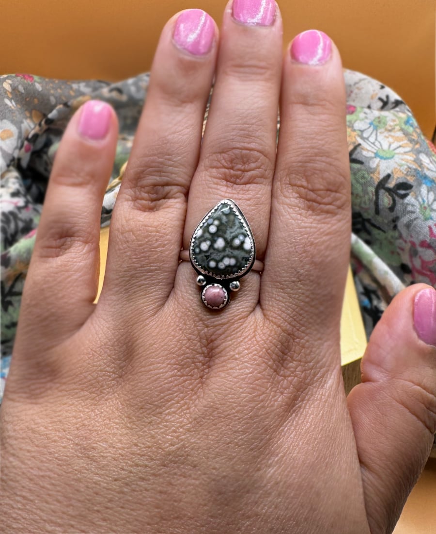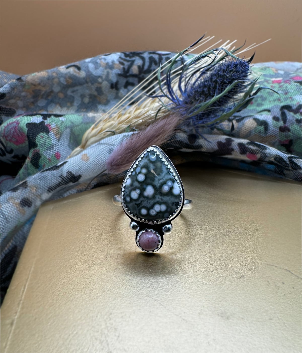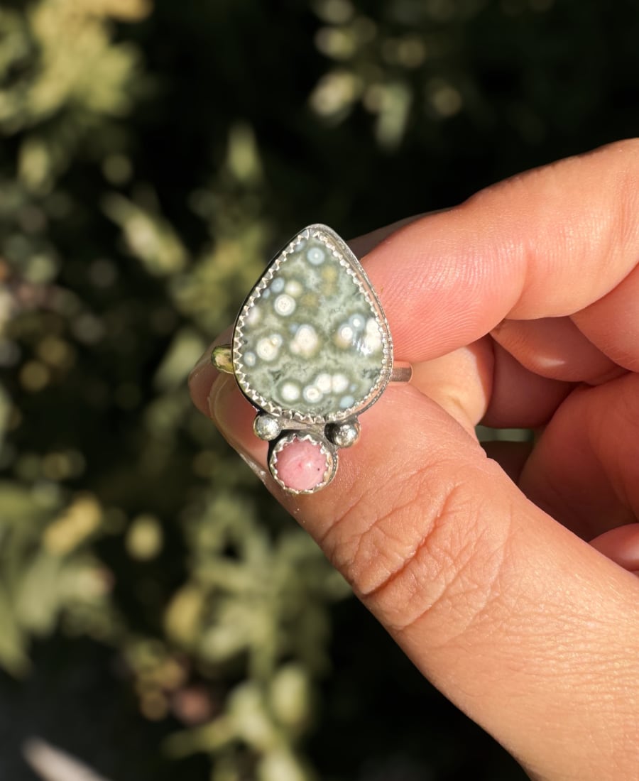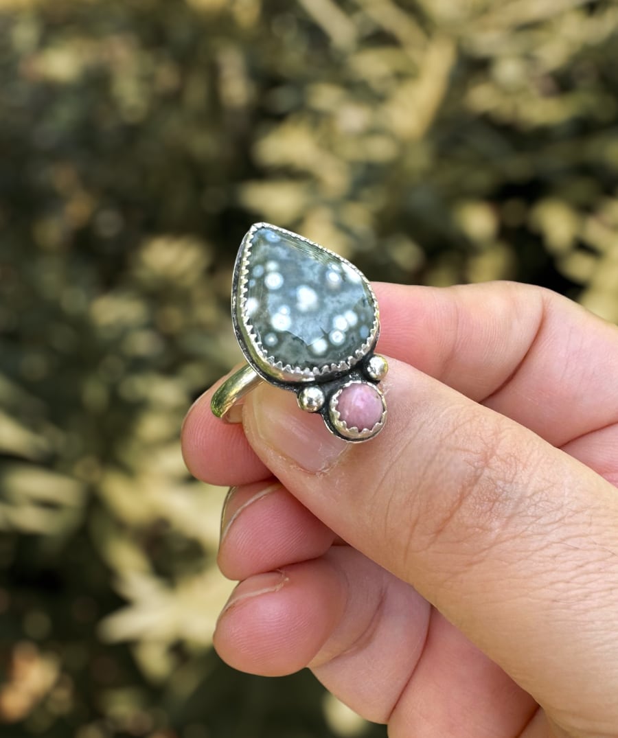 Elevating your ring game with this beautiful ocean jasper ring, accented with a pink rhodonite stone and handforged silver balls. Such a fun colorful ring. The band is a comfortable 2.1 millimeters wide and can fit sizes between 8.75 to 9. It can also be sized up a half size.