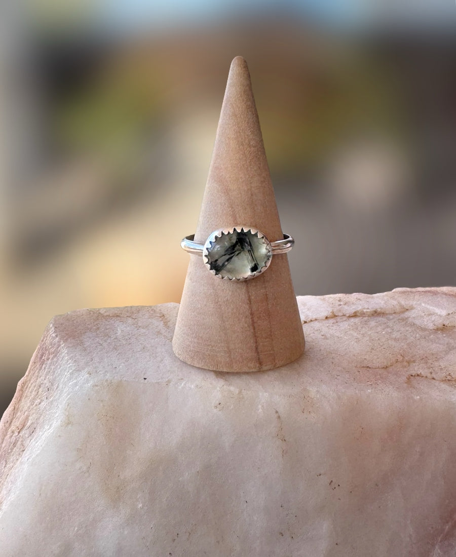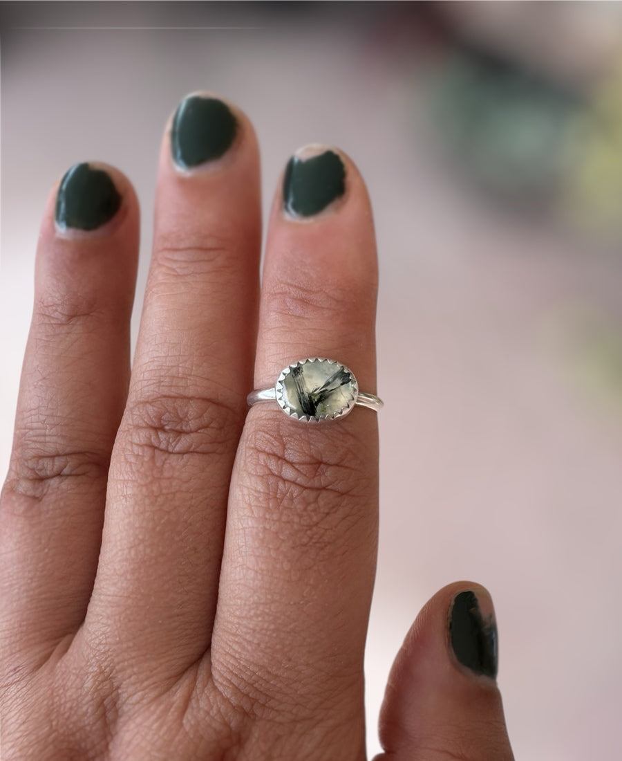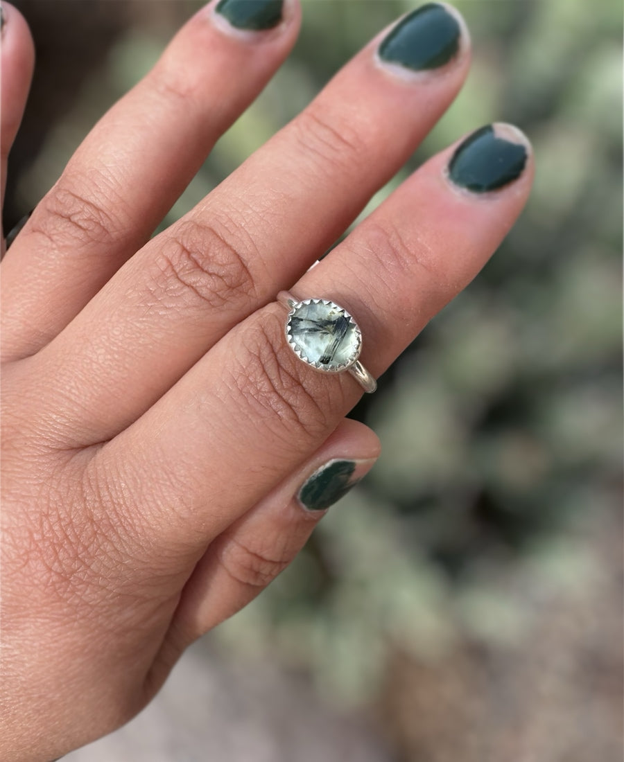 This prehnite stone, with its dark green tourmaline thread-like inclusions, glows softly, much like sunlight filtering through green leaves. It's a calming stone. This listing is for the solitaire ring only. This ring can be sized up a half size. Please leave a note upon checkout.