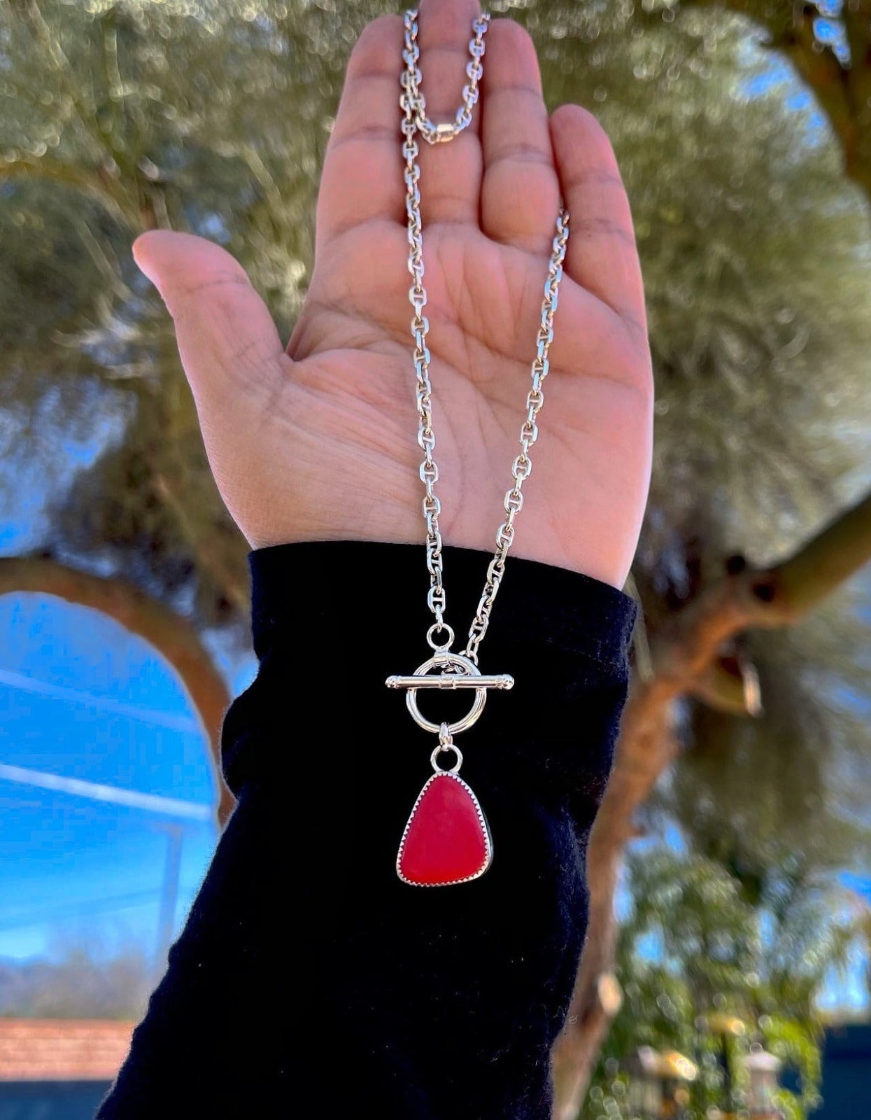 Give a pop of color to your outfit with this stunning red rosarita stone necklace. Pendant is on a sterling silver gucci chain and features a front toggle clasp for easy closure! Chain measures 21 inches long including the toggle clasp.