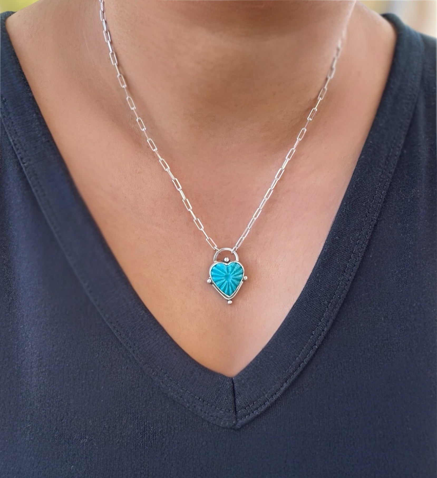 This heart shaped stone is a stunning blue color, quintessential of turquoise. The carved stone is as special as it is unique. A great layering necklace or wear it every day on its own. It is on an 18 inch paper clip chain plus 2 inch extender so can be worn up to 20 inches.