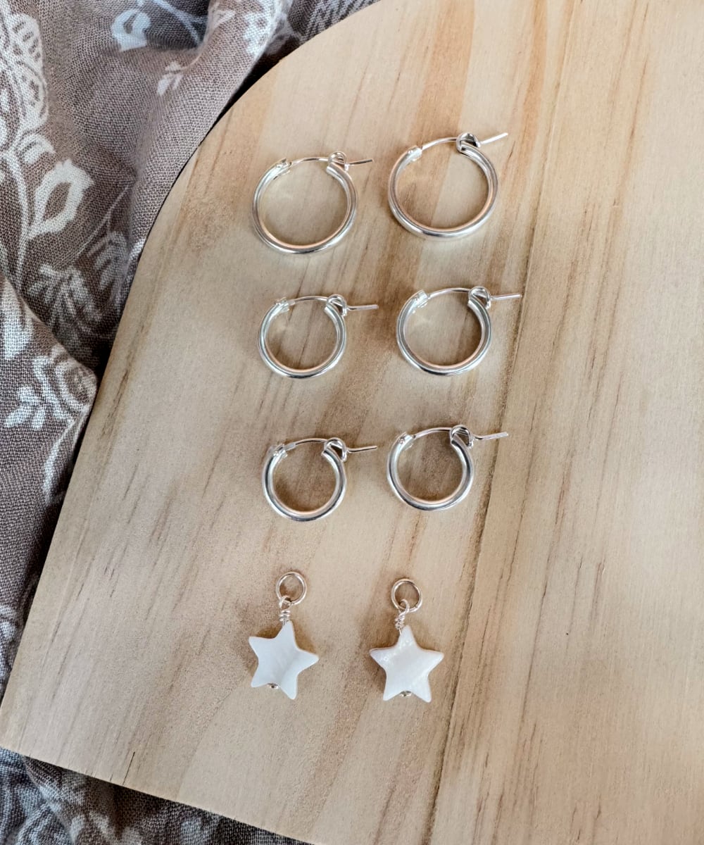 A good pair of sterling silver hoops never go out of style. They are lightweight, and easy to wear, with a satisfying click catch on the back for a secure earring. These hoop earrings are perfect for everyday wear and easily stacked if you have multiple piercings! Elevate your look by adding a charm to your hoops! Mix and match charms to change up your look! Select your hoop size and charm (or hoops only!) for your own unique look.