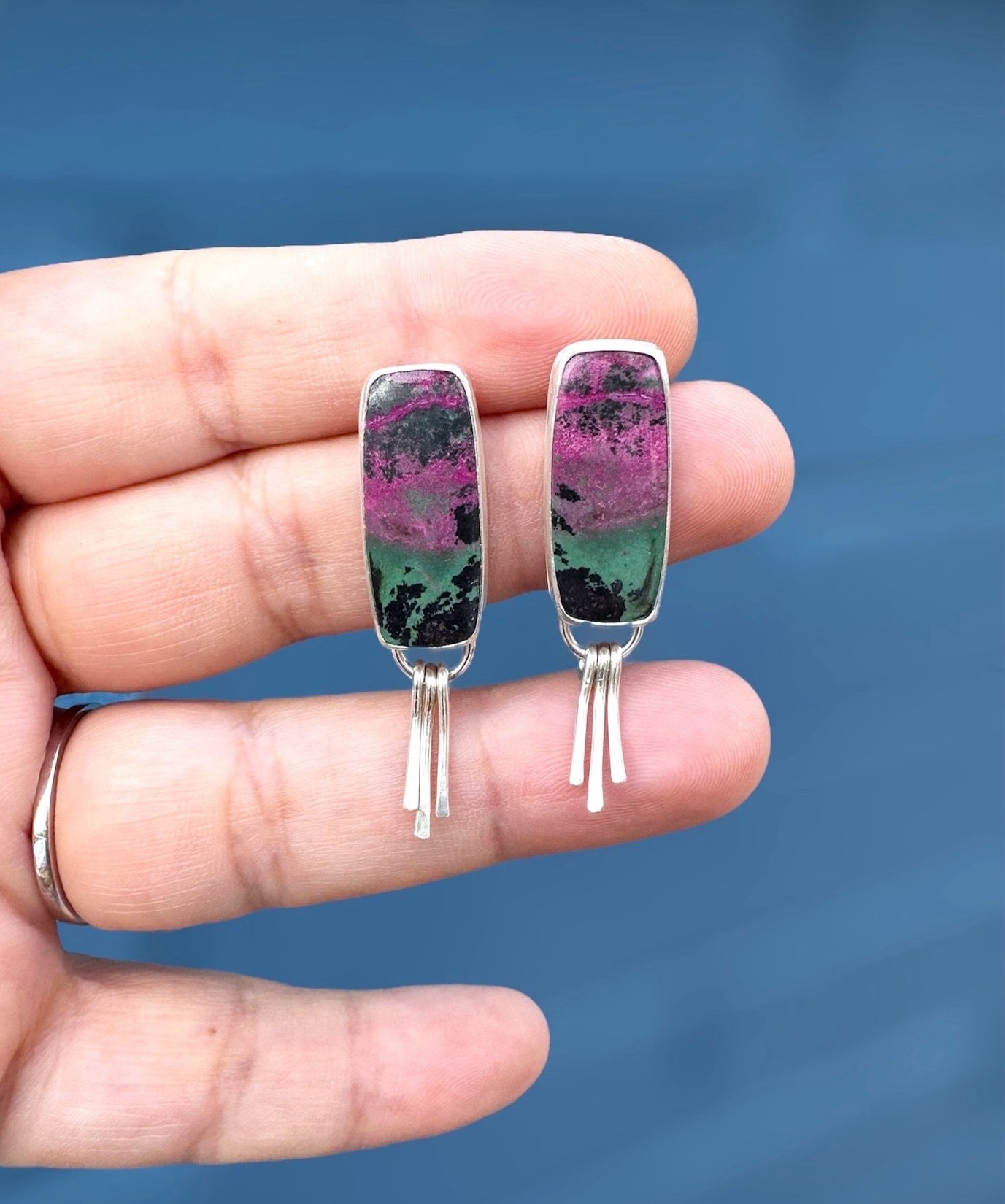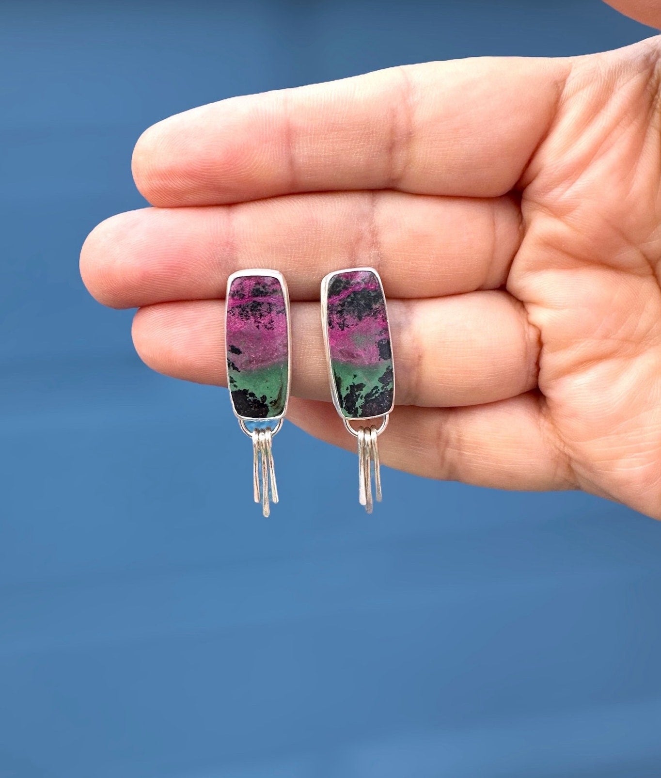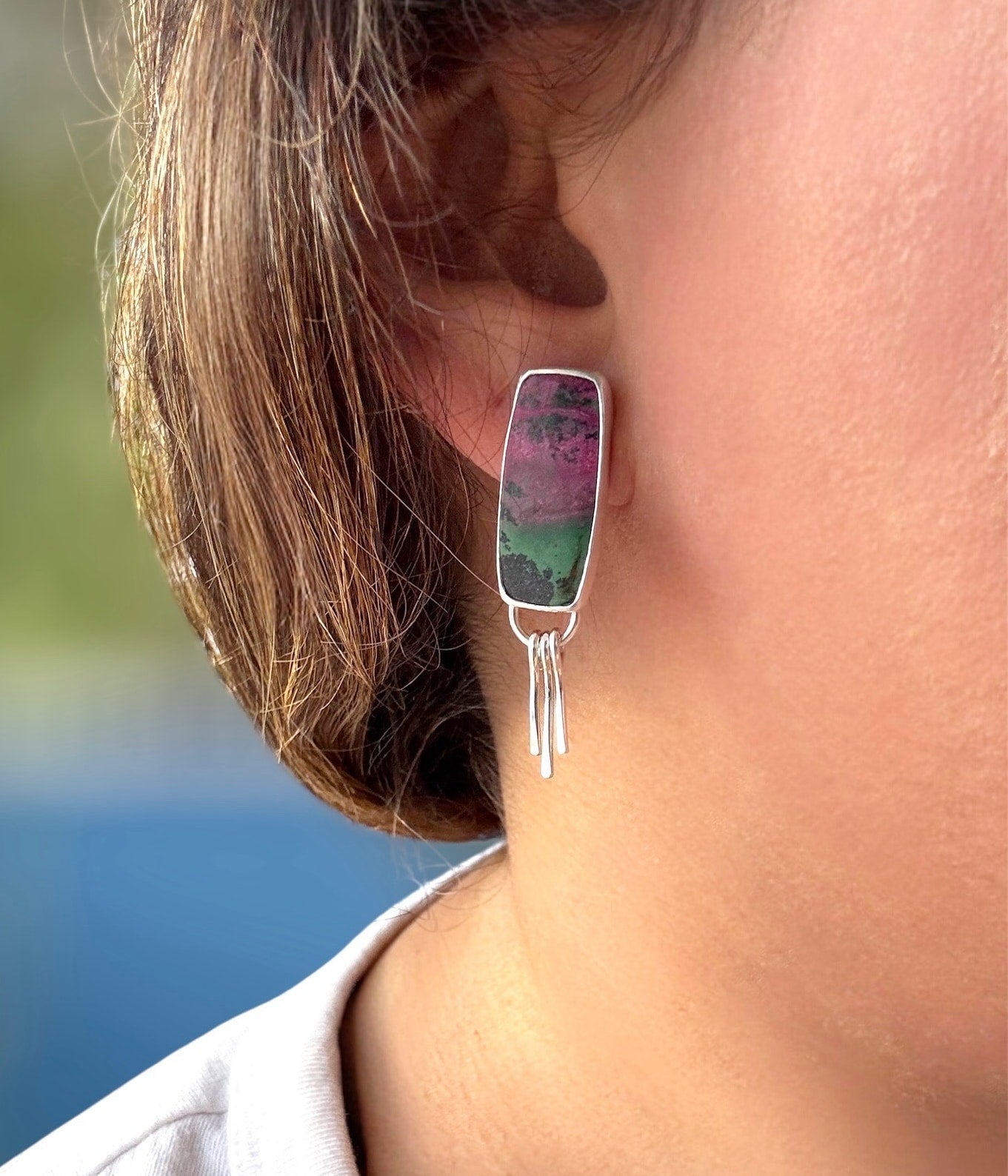 Add a pop of vibrant color to your look with these earrings featuring some of the most stunning ruby zoisite stones. The mix of deep pinks and greens, and natural black inclusions make for a pretty scene on your ears! Finished with a little silver fringe dangles that sway with movement, these earrings are the perfect balance of playful and modern. Lightweight and versatile, they’re ideal for adding a touch of artistry to your everyday style or making a statement on special occasions.