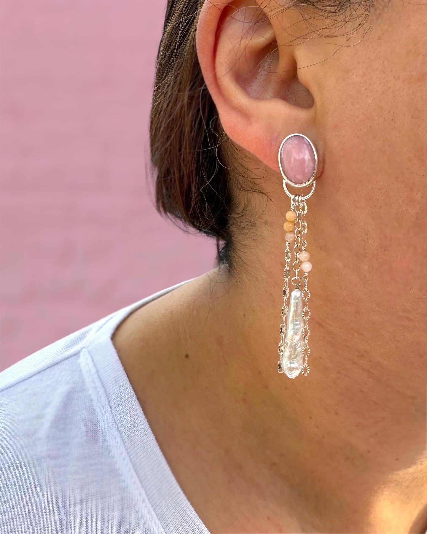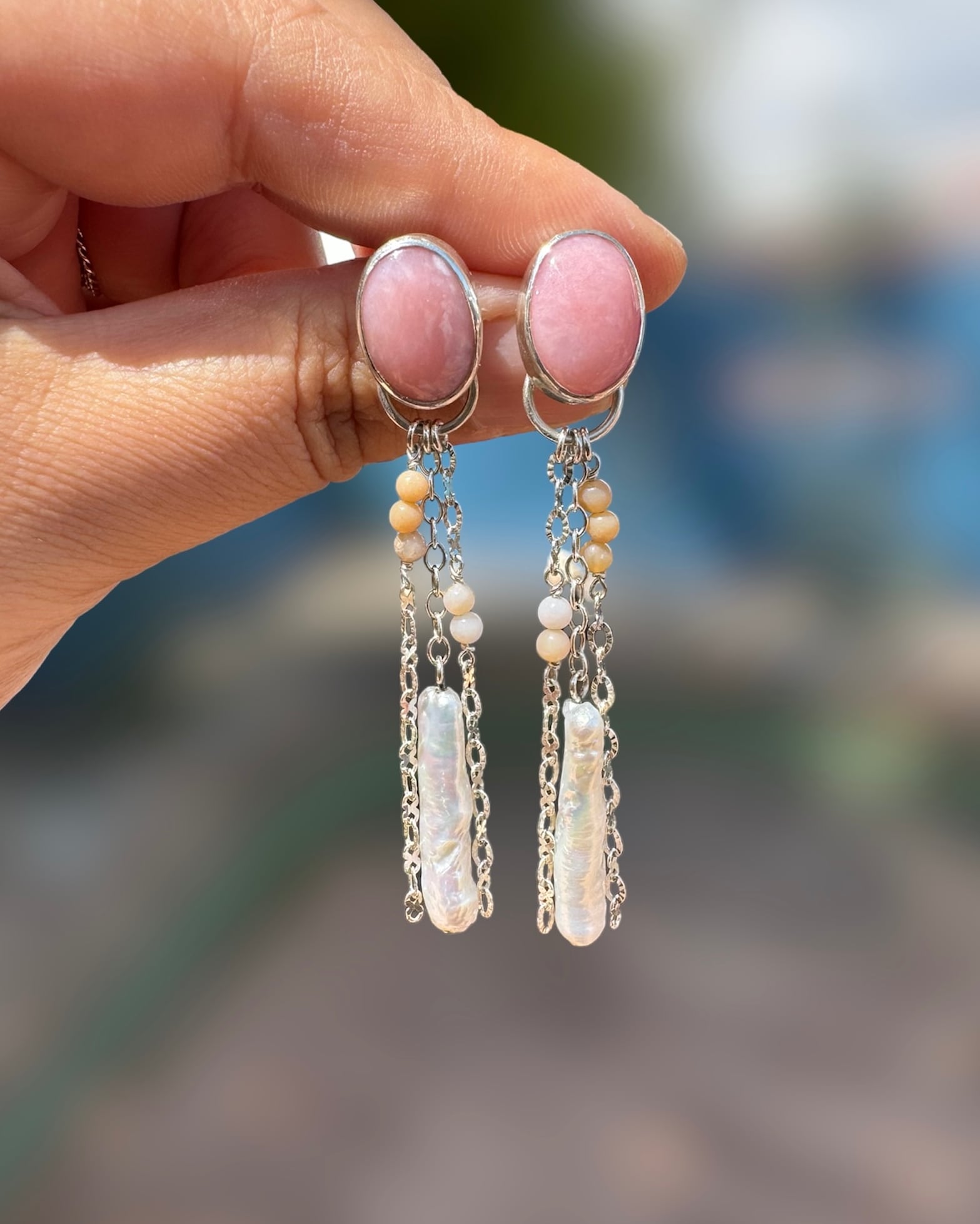 These would be perfect stunning bridal earrings! Oval shaped pink opal stones set in sterling silver, with dangly sterling silver chain that has pink opal beads and baroque stick pearls. These earrings are lightweight and effortlessly flowy.