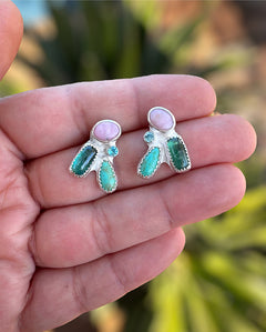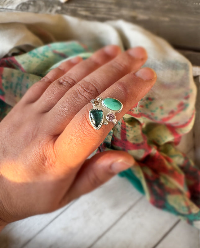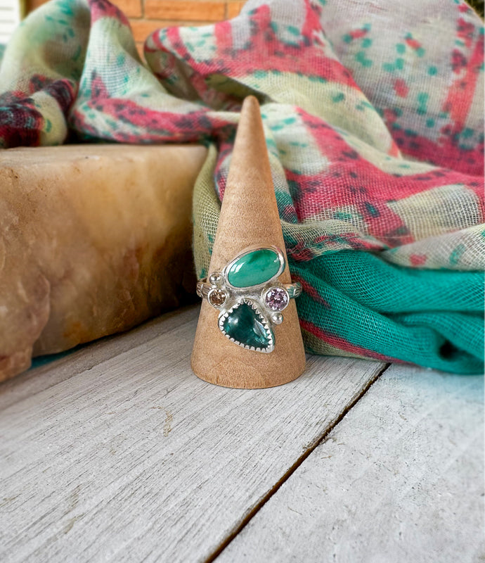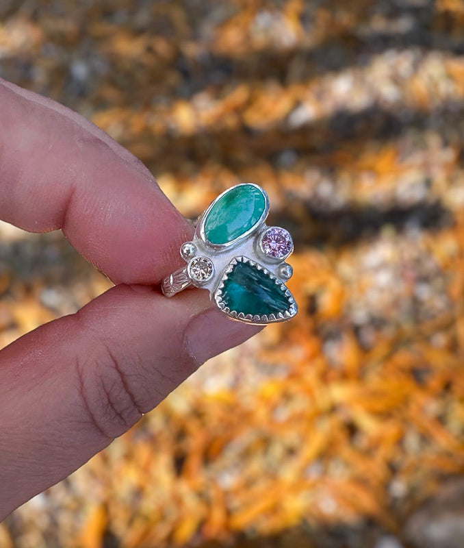 Turquoise, kyanite, and two round cubic zirconia's come together in this beautifully crafted ring. The champagne and pink cz's and little silver balls accented on each side make this ring sparkle! This would make a gorgeous special occasion ring. Hand stamped ring band