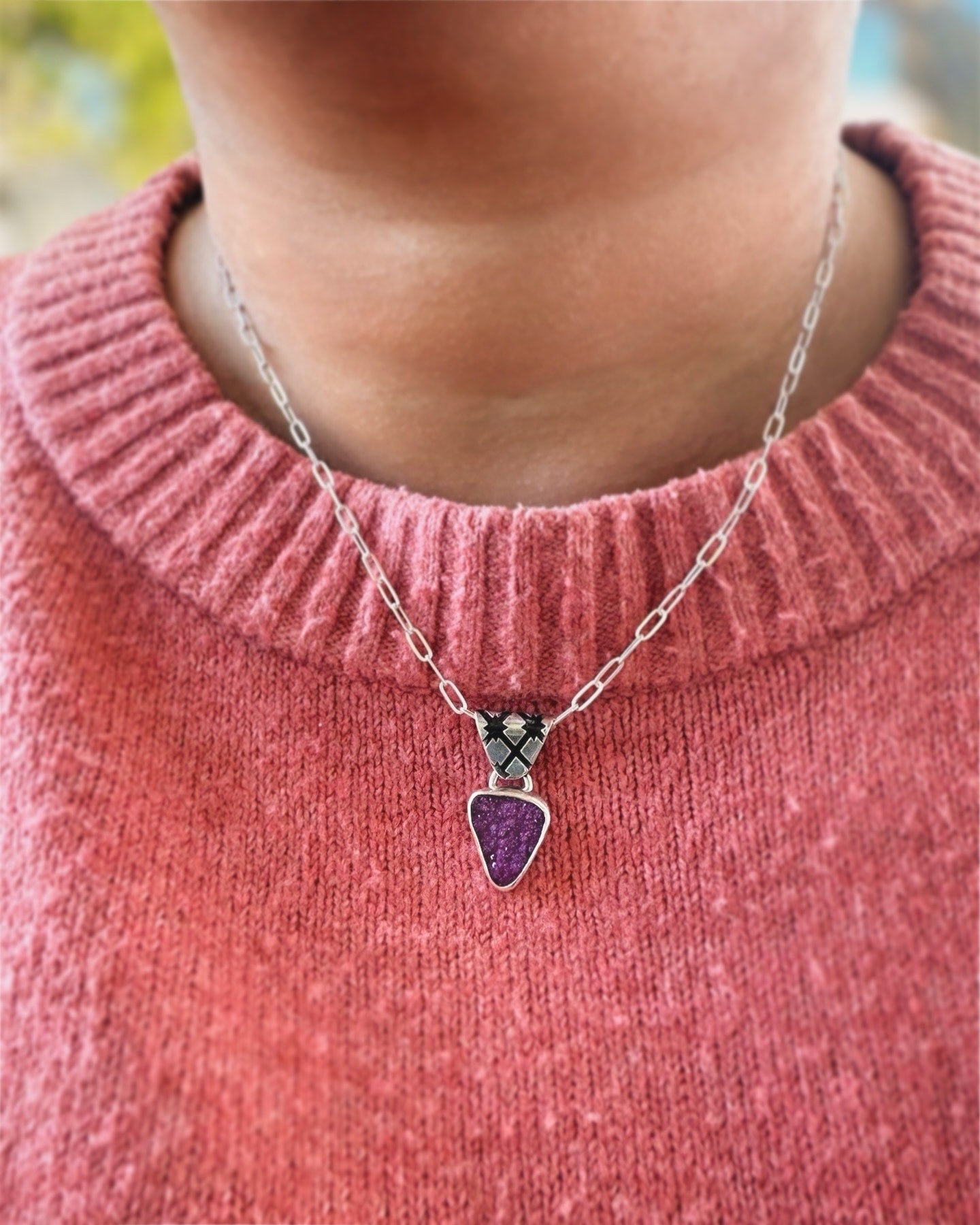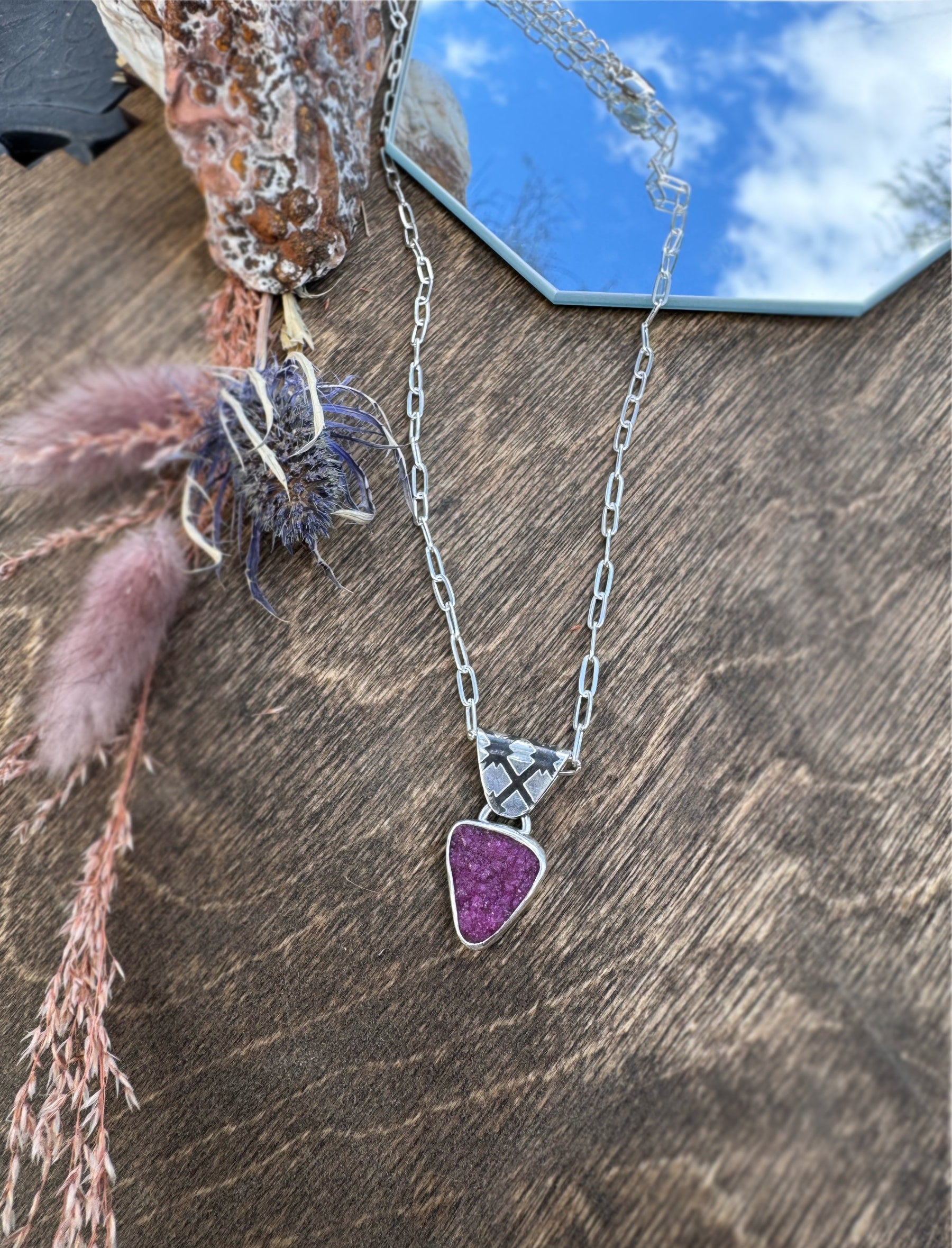 The bright bold magenta stone contrasts beautifully with the cool silver tones, creating a striking combination. Hanging on a paperclip chain, this necklace is perfect for anyone who loves meaningful, handcrafted jewelry that tells a story.