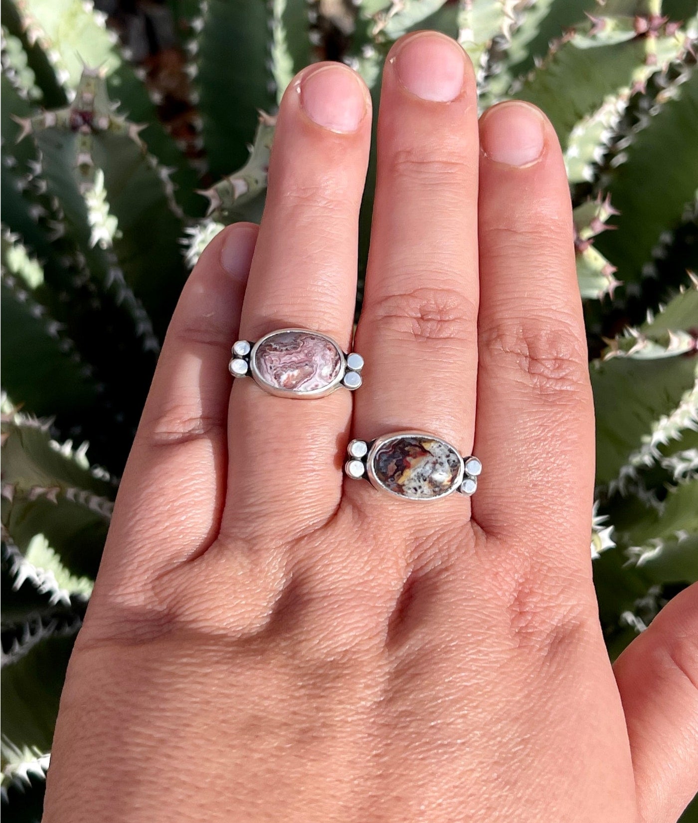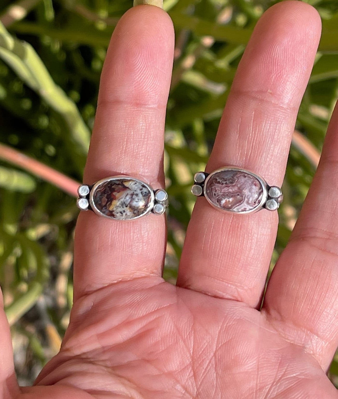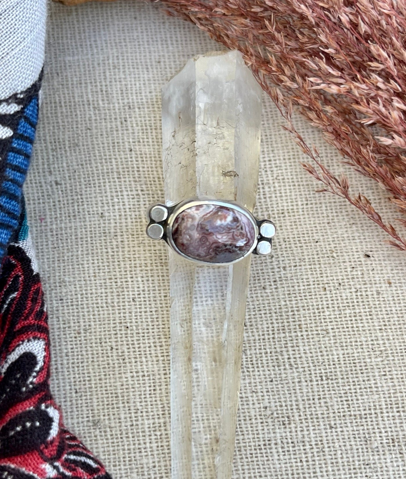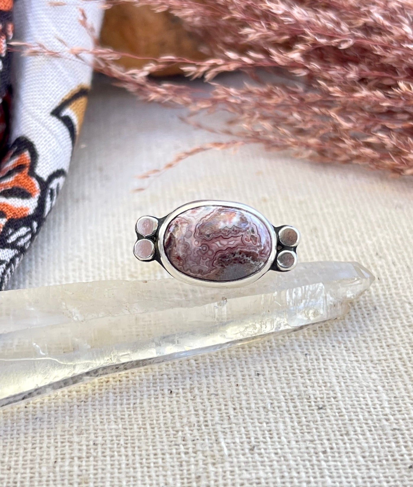 This sterling silver ring features a crazy lace agate oval stone set horizontally with flattened bead accents on each side.
