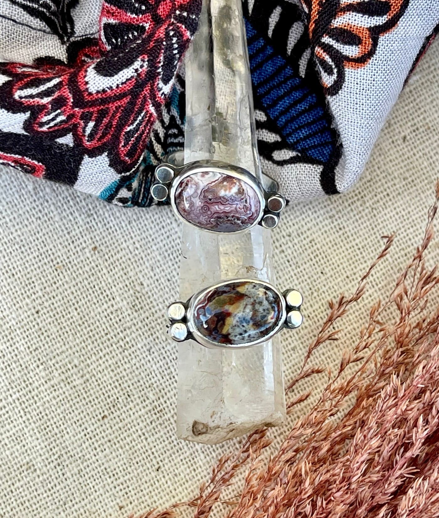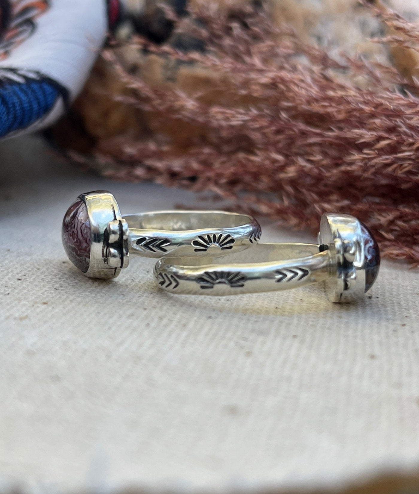 Crazy lace agate is a super cool stone with lacy swirls and variations in the stone. The band features hand stamped detailing and is 3.5mm wide.