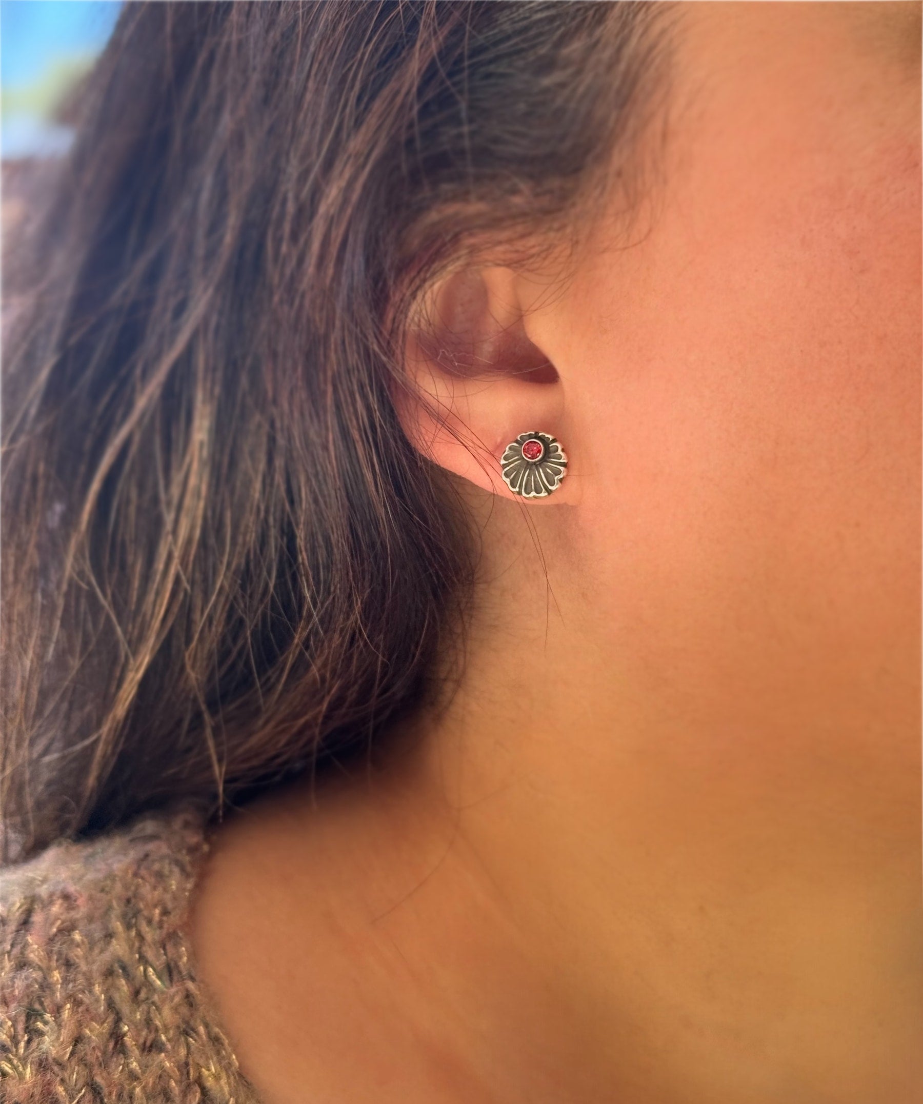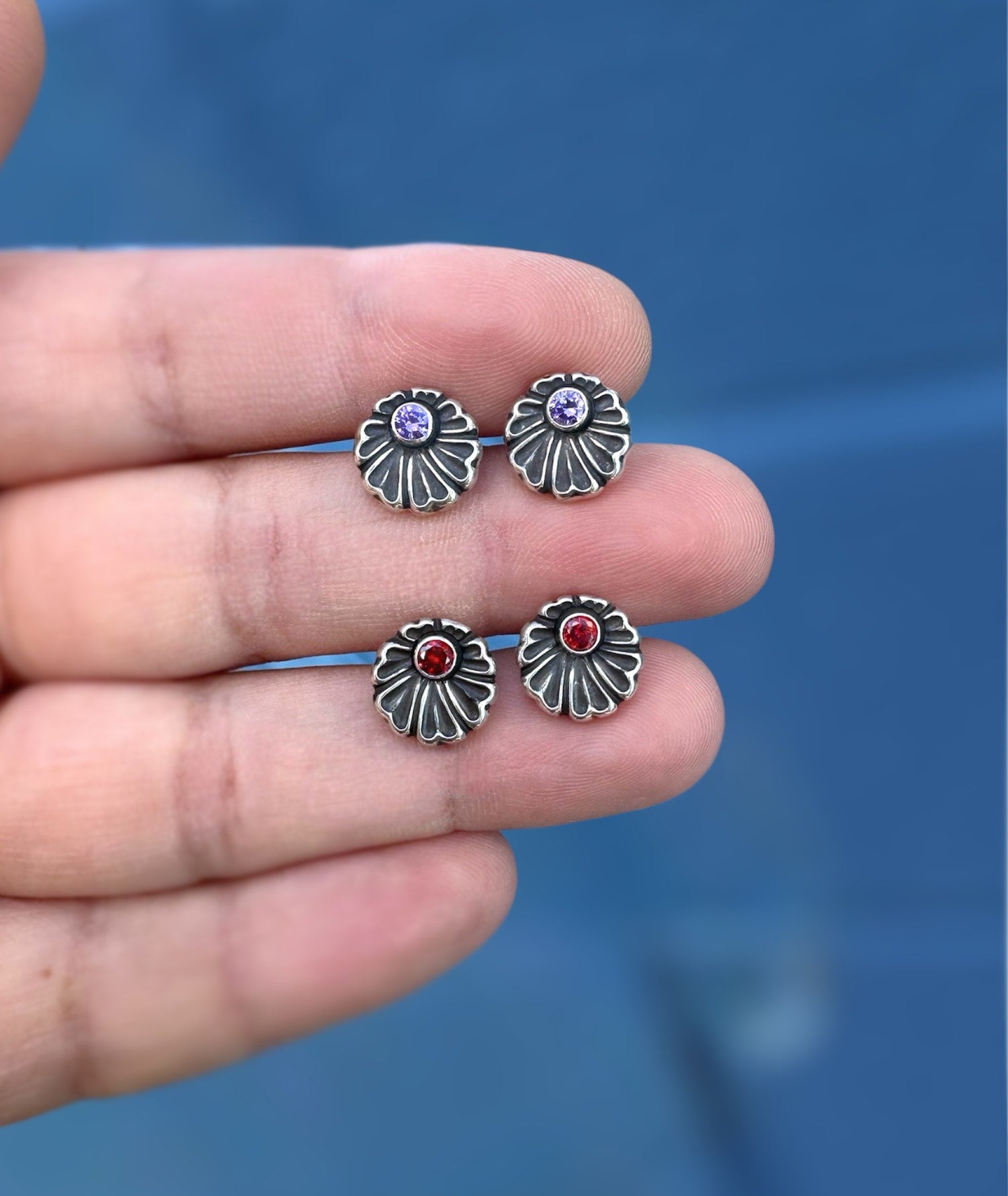 A modern twist on the classic studs. These sterling silver studs feature hand-made floral form with hand set cubic zirconia - choose from vibrant purple or rich red. Each earring is handcrafted from sterling silver and was oxidized to highlight the texture and depth of the floral design.