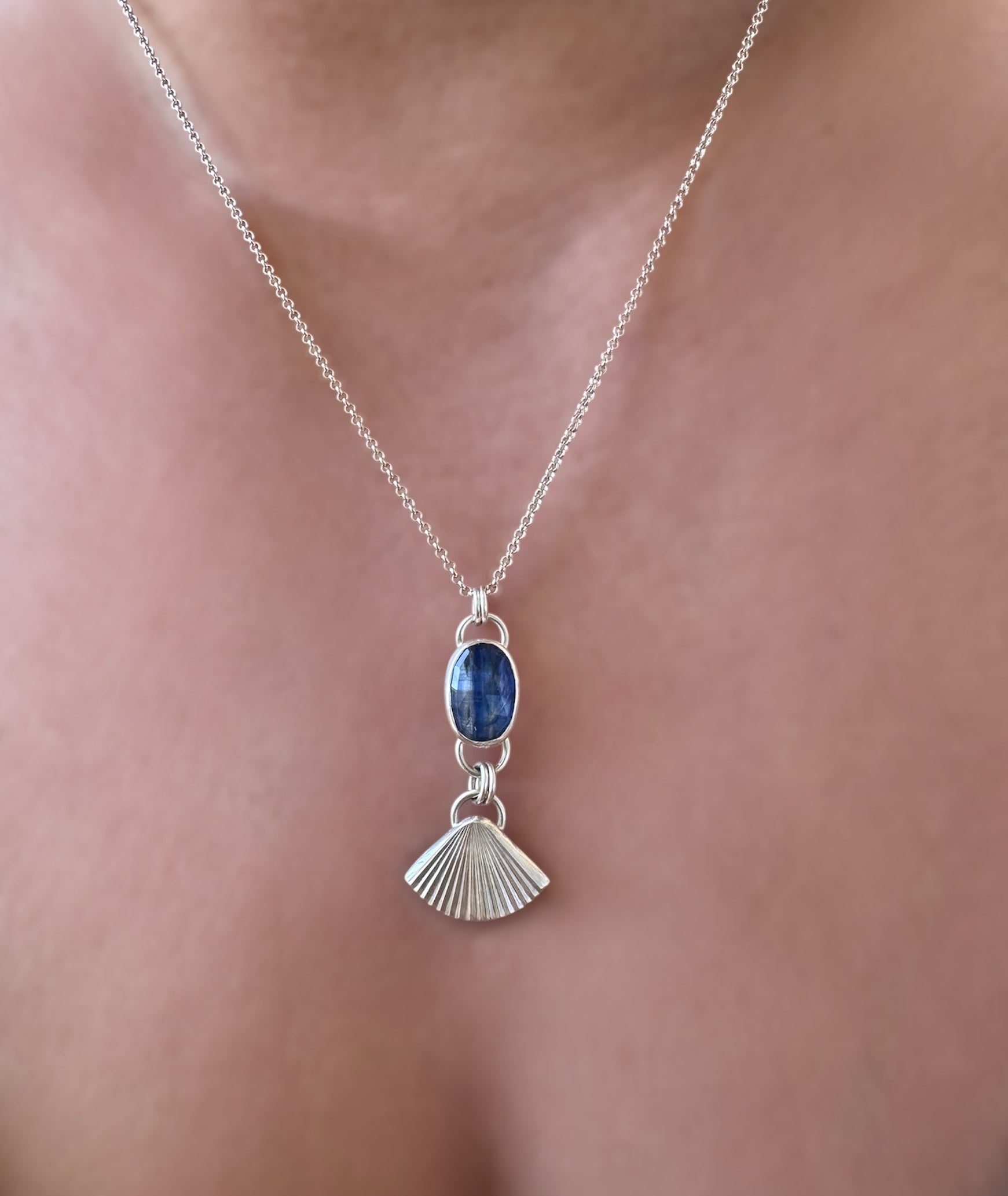 This faceted kyanite is such a gorgeous stone with just the right amount of sparkle! A fan shell charm dangle hangs from the stone. This necklace lays beautifully and such a fun whimsical piece! Perfect on its own or layer with other chains and necklaces!