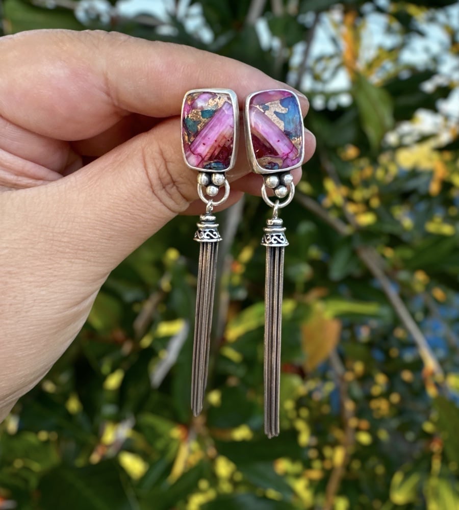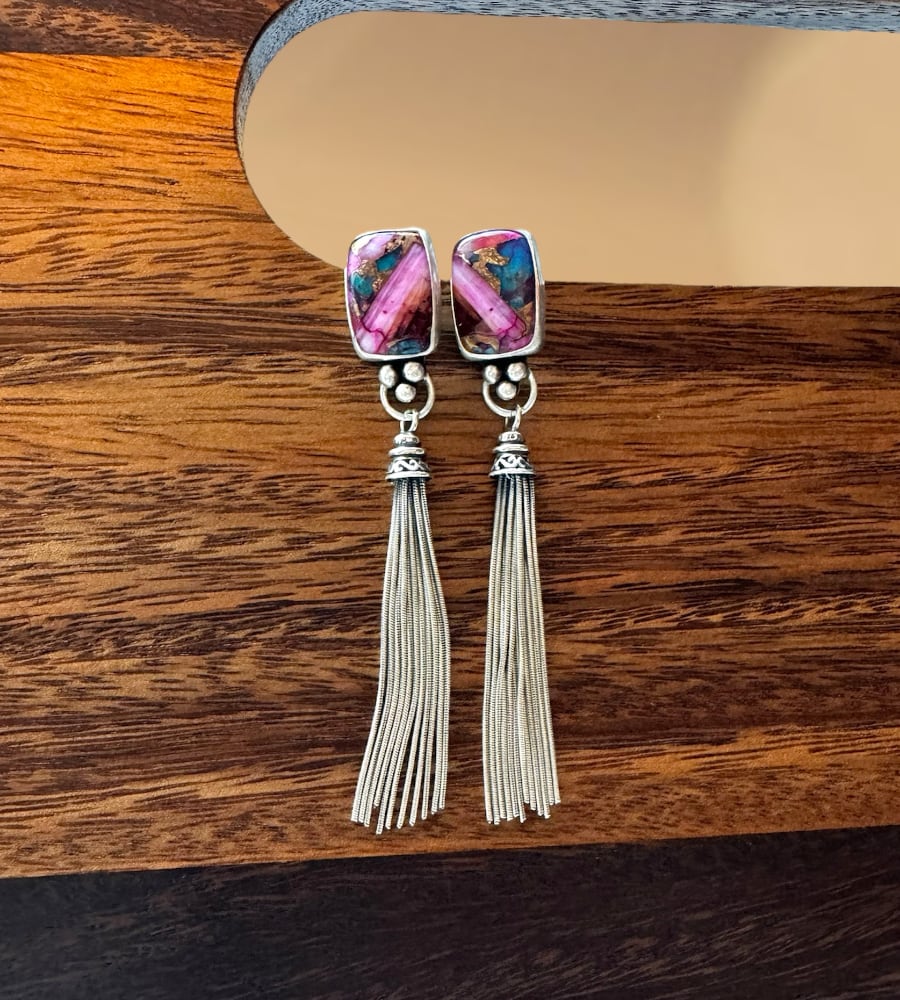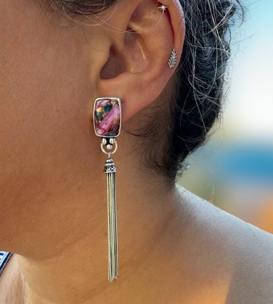 Add a bold, Southwest-inspired touch to your look with these stunning Kingman turquoise spiny oyster shell stone earrings! Set in sterling silver, these beauties are finished with playful silver fringe that dangles elegantly, adding movement and flair. The perfect way to make a statement on your ears! The earrings are 3 inches in length and each earring weighs about 7 grams - the equivalent of a nickel and dime.