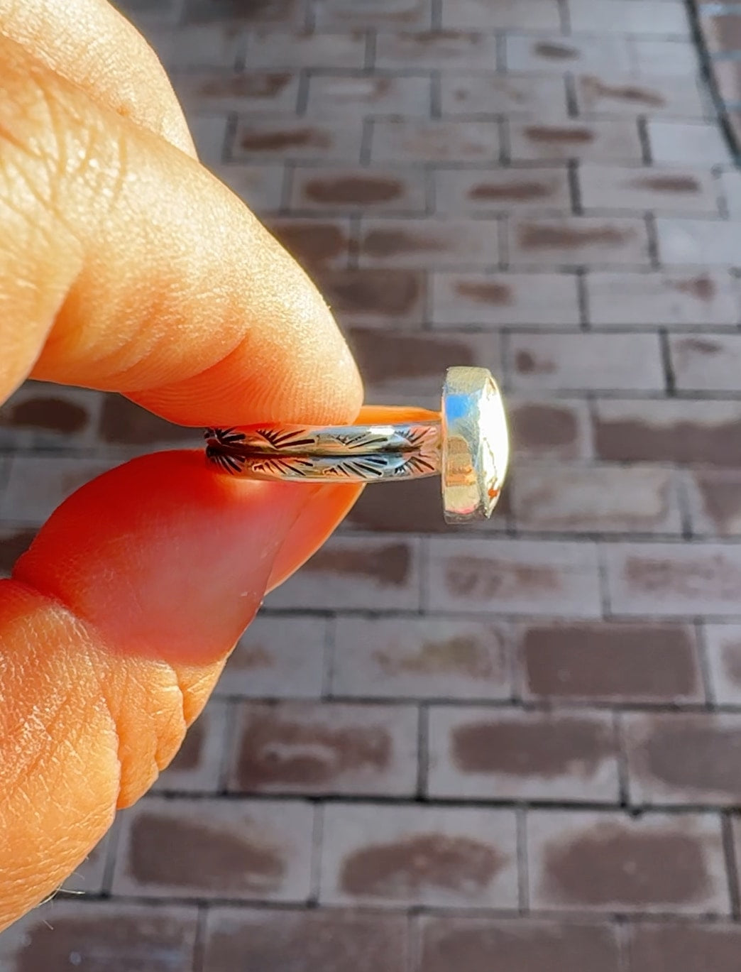The double hand stamped sterling silver band adds a touch of texture and artistry, giving this ring a bold yet classic feel. Handcrafted and perfect for everyday wear or as a statement ring.